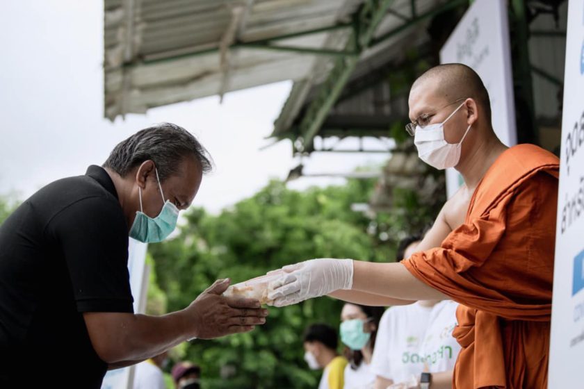 ขณะที่ พระมหาทวี โพธิเมธี เจ้าอาวาสวัดพุทธปัญญา จ.นนทบุรี เล่าวว่า บริเวณชุมชนรอบๆ วัดได้รับผลกระทบจากโควิดเป็นจำนวนมาก เนื่องจากเป็นพื้นที่แออัด ผู้คนอาศัยหนาแน่น ทำให้เกิดการแพร่ระบาดของเชื้อไวรัสต่อกันได้ง่าย วัดจึงตั้งเป็นศูนย์กลางของชุมชน เพื่อให้ความช่วยเหลือกับชาวบ้านที่เดือดร้อน โดยมีโครงการครัวปันอิ่มฯ ของเครือ CP-CPF และภาคีเครือข่ายต่างๆ นำข้าวกล่องมาสนับสนุน อาตมาจึงจัดแบ่งตามความเหมาะสมกระจายออกไปรอบๆ 14 ชุมชน ทุกครั้งที่พวกเขาได้รับอาหาร สัมผัสได้ว่า พวกเขามีความสุข เด็กเล็กรีบวิ่งออกมารับจนเป็นภาพชินตา นับว่าสุขใจผู้ให้ด้วย เพราะ 1-2 เดือนที่ผ่านมา หลายคนได้รับความเดือดร้อนอย่างมาก ข้าวหนึ่งกล่อง นอกจากจะเติมพลังกายแล้ว ยังเป็นพลังใจหล่อเลี้ยงพวกเขาเช่นกัน