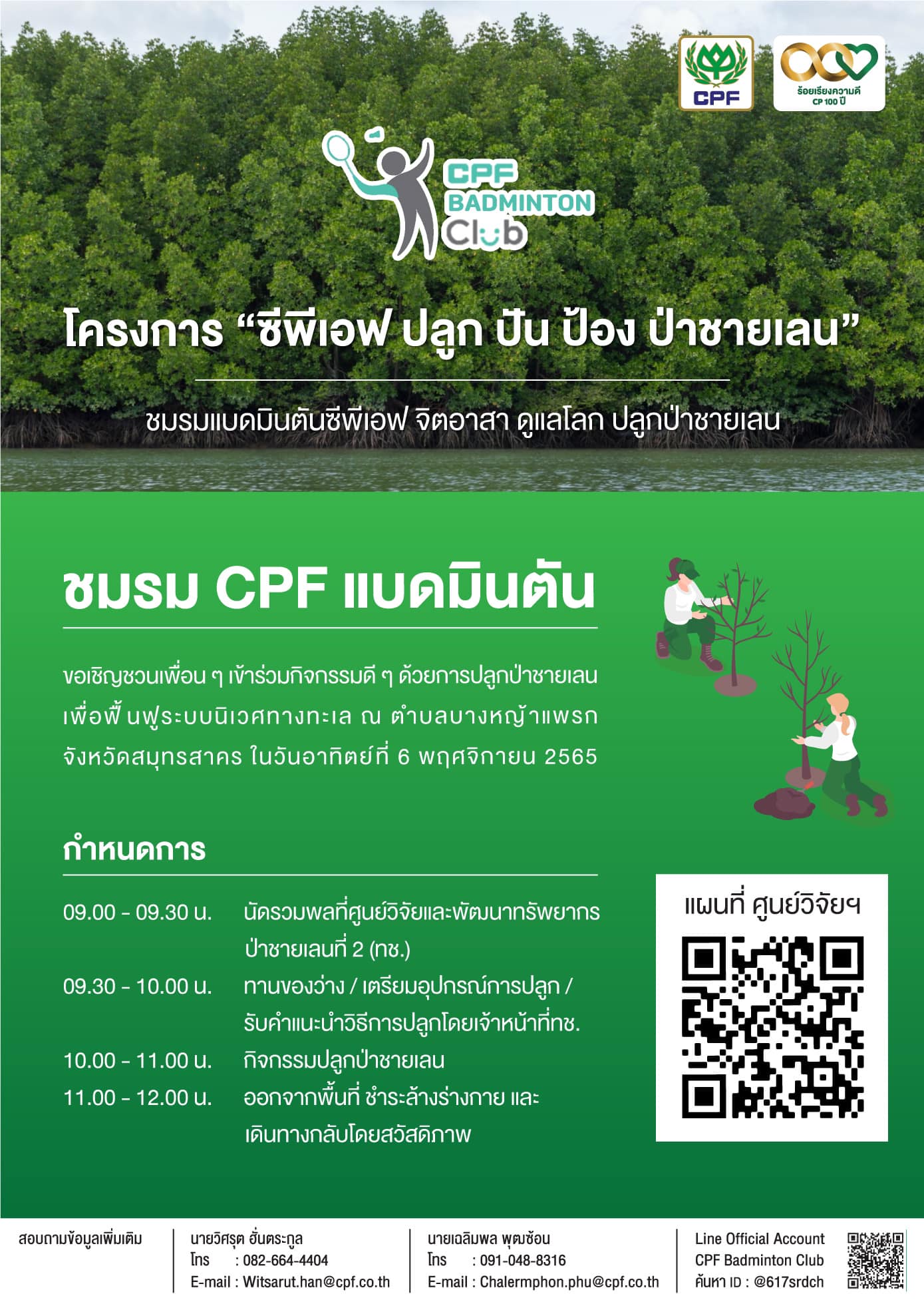 ชมรมแบดมินตันซีพีเอฟ ร่วมกับ โรงงานอาหารสัตว์น้ำมหาชัย และ สำนักงานทรัพยากรธรรมชาติและสิ่งแวดล้อม จ.สมุทรสาคร เดินหน้าโครงการ “ซีพีเอฟ ปลูก ปัน ป้อง ป่าชายเลน” พร้อมกิจกรรมสนุกๆ ตลอดวัน