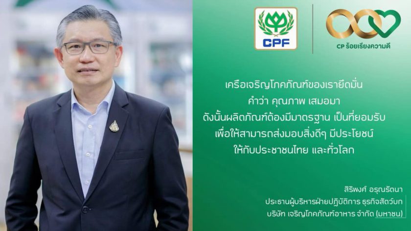 “เครือเจริญโภคภัณฑ์ของเรายึดมั่น คำว่า คุณภาพ เสมอมา ดังนั้น ผลิตภัณฑ์ต้องมีมาตรฐานเป็นที่ยอมรับ เพื่อให้สามารถส่งมอบสิ่งดีๆ มีประโยชน์ ให้กับประชาชนไทยและทั่วโลก”