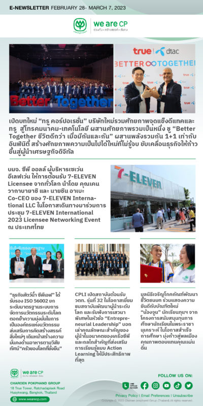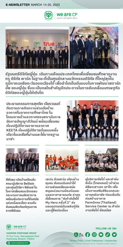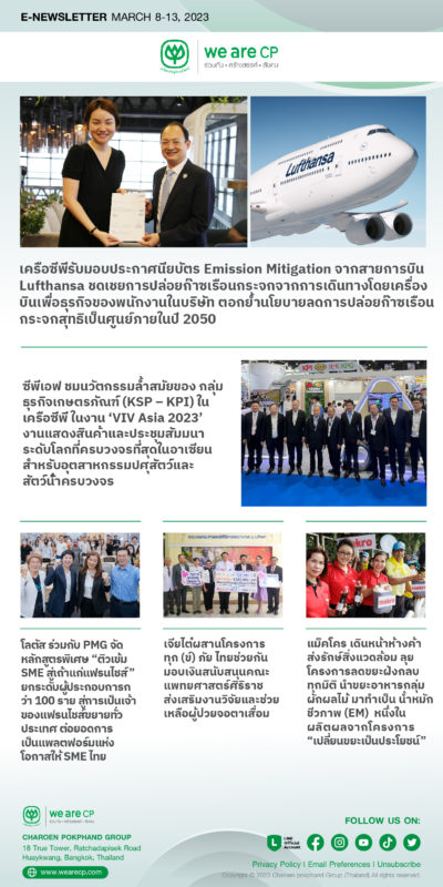 homepage เครือซีพีระดมทีม ‘ซีพีอาสา’ จากทุกกลุ่มธุรกิจ ผนึกกำลังอย่างไม่หยุดยั้ง จัดเตรียม “ถุงกำลังใจ” ฟื้นฟูหลังน้ำท่วม พร้อมส่งต่อความห่วงใยถึงพี่น้องในจังหวัดภาคใต้อย่างต่อเนื่อง 1 ธันวาคม 2568SystemNews, กิจกรรมเพื่อสังคม, ข่าวเด่น 5G Net SIM Employee – เน็ตแรง ราคาดีที่สุดสำหรับพนักงานเครือซีพี 27 พฤศจิกายน 2568SystemCP Privilege, กิจกรรมและสิทธิประโยชน์, สิทธิประโยชน์พนักงานเครือซีพี ชวนชาวซีพีร่วมส่งต่อพลังแห่งการให้ กับมูลนิธิรามาธิบดี 💙 24 พฤศจิกายน 256825 พฤศจิกายน 2025SystemNews, กิจกรรมเพื่อสังคม เครือเจริญโภคภัณฑ์มอบหน้ากากอนามัยซีพี 55,000 ชิ้น แก่คณะแพทยศาสตร์ศิริราชพยาบาลและคณะพยาบาลศาสตร์ มหาวิทยาลัยมหิดล สานต่อค่านิยม ‘3 ประโยชน์’ สนับสนุนบุคลากรด่านหน้าเพื่อสุขภาพประชาชน 19 พฤศจิกายน 256819 พฤศจิกายน 2025SystemNews, กิจกรรมเพื่อสังคม 🎁 Gift Card สุดคุ้มจาก Ascend Travel! ซื้อวันนี้ รับเครดิตเพิ่มสูงสุด 15% 19 พฤศจิกายน 256819 พฤศจิกายน 2025SystemNews, สิทธิประโยชน์พนักงานเครือซีพี 🎉 สิทธิพิเศษสำหรับพนักงานเครือซีพี! โครงการสนับสนุนรถยนต์ไฟฟ้า MG (CP Employee Program) 17 พฤศจิกายน 256817 พฤศจิกายน 2025SystemNews, สิทธิประโยชน์พนักงานเครือซีพี “ประธานอาวุโสธนินท์” นำซีพีจับมือ “มู่หยวนกรุ๊ป” ผู้ผลิตสุกรรายใหญ่ของจีน เดินหน้าความร่วมมือเทคโนโลยีปศุสัตว์ พร้อมศึกษาดูงานฟาร์ม “คอนโดหมู” นวัตกรรมเด่นของมู่หยวน 11 ธันวาคม 256811 ธันวาคม 2025SystemNews, ข่าวผู้บริหาร “ท่านประธานอาวุโสธนินท์–ท่านประธานกรรมการสุภกิต-ท่านซีอีโอศุภชัย” ศึกษาดูงานหุ่นยนต์และ AI ชั้นนำของจีน เร่งมองหาเทคโนโลยีอนาคตเพื่อยกระดับธุรกิจเครือซีพี 11 ธันวาคม 256811 ธันวาคม 2025SystemNews, ข่าวผู้บริหาร “ท่านประธานอาวุโสธนินท์” เยือนซัวเถา ศึกษาศักยภาพอุตสาหกรรมสิ่งทอ–ของเล่นเชิงสร้างสรรค์ พร้อมหนุนสู่เวทีโลก 11 ธันวาคม 256811 ธันวาคม 2025SystemNews, ข่าวผู้บริหาร วิวัฒนาการของเครือซีพี (ตีพิมพ์ในนิตยสาร นิเกอิ เอเชียน รีวิว) “ศุภชัย เจียรวนนท์” ผู้นำเครือซีพี – ทรู คว้า 2 รางวัลใหญ่จาก THE LEADERSHIP AWARDS 2025 ทั้ง CEO People’s Choice Award และรางวัล Digital Transformation Award สะท้อนบทบาทผู้นำเอกชนในการขับเคลื่อนโครงสร้างพื้นฐานดิจิทัลของไทย 4 ธันวาคม 25684 ธันวาคม 2025SystemNews, ข่าวเด่น CP Sustainability COE: ก้าวใหม่ของซีพี ขับเคลื่อน 3 Big Goals สู่อนาคตยั่งยืน 2 ธันวาคม 25682 ธันวาคม 2025SystemNews, ข่าวเด่น, ซีพีเพื่อความยั่งยืน เครือซีพีระดมทีม ‘ซีพีอาสา’ จากทุกกลุ่มธุรกิจ ผนึกกำลังอย่างไม่หยุดยั้ง จัดเตรียม “ถุงกำลังใจ” ฟื้นฟูหลังน้ำท่วม พร้อมส่งต่อความห่วงใยถึงพี่น้องในจังหวัดภาคใต้อย่างต่อเนื่อง 1 ธันวาคม 2568SystemNews, กิจกรรมเพื่อสังคม, ข่าวเด่น “เครือเจริญโภคภัณฑ์ เขตป