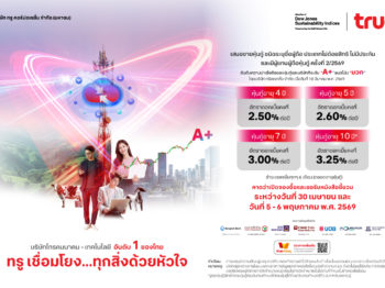 ทรู ประกาศดอกเบี้ยหุ้นกู้ชุดใหม่ อายุ 4 – 10 ปี ที่ 2.50 – 3.25% ต่อปี ชูทางเลือกที่มั่นคง เสริมแกร่งพอร์ตลงทุน รับมือตลาดการเงินผันผวน 21 เมษายน 256921 เมษายน 2026SystemNews, ข่าวธุรกิจ, ข่าวเด่น