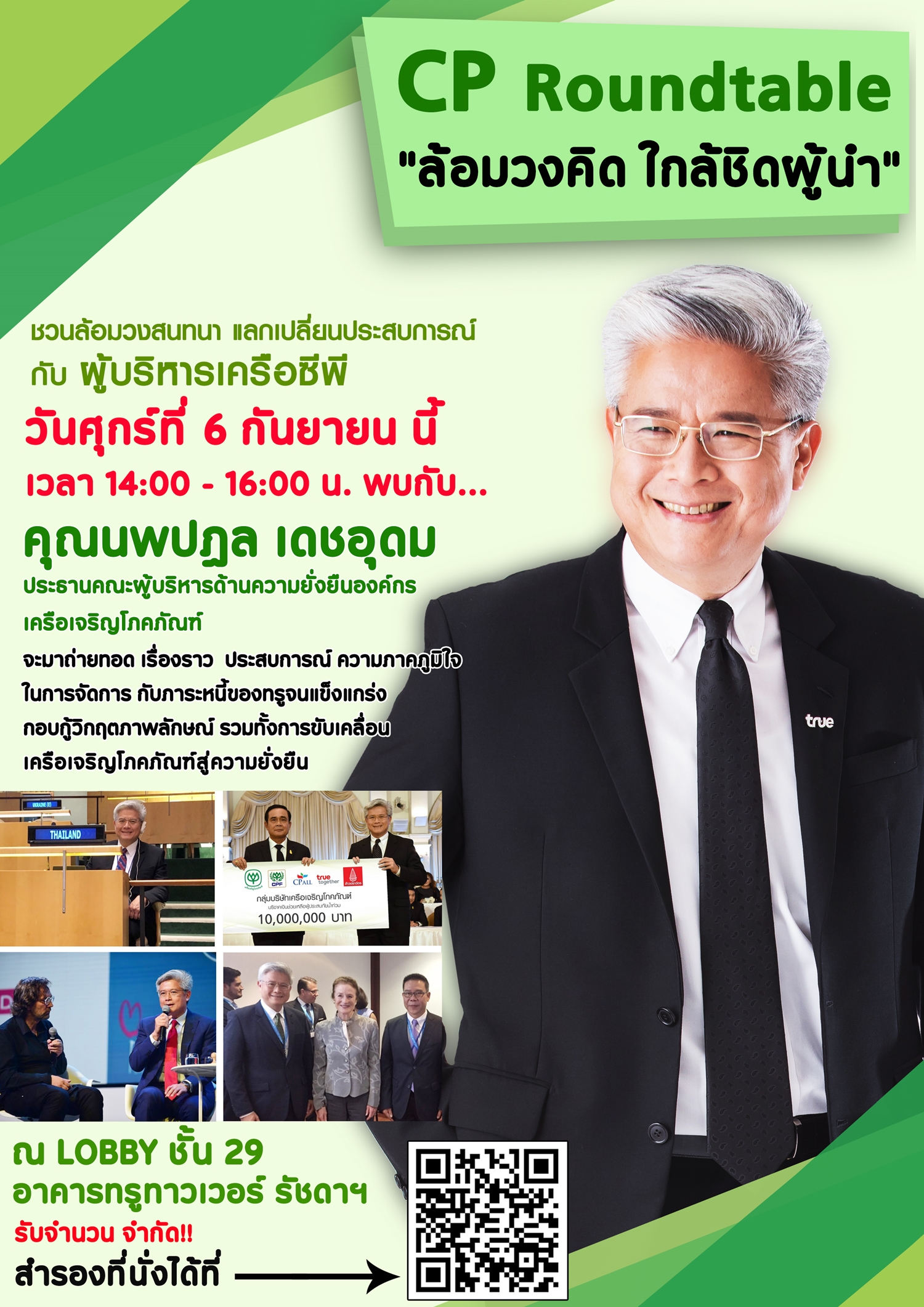 กิจกรรม CP Roudtable ล้อมวงคิดขอเชิญชวนผู้บริหาร พนักงานในเครือซีพีร่วมกิจกรรมฟังการถ่ายทอดประสบการณ์การทำงาน บทเรียน เคล็ดลับความสำเร็จการจัดการงาน คน สังคม การใช้ 6 ค่านิยมขับเคลื่อนองค์กร จากผู้บริหารเครือเจริญโภคภัณฑ์ครั้งที่ 5 : โดย คุณนพปฎล เดชอุดม ประธานคณะผู้บริหารด้านความยั่งยืนองค์กร เครือเจริญโภคภัณฑ์ มาร่วมถ่ายทอดเรื่องราว ประสบการณ์ ความภาคภูมิใจในการจัดการ กับภาระหนี้ของทรูจนแข็งแกร่ง การกอบกู้วิกฤตภาพลักษณ์เครือฯรวมทั้งการขับเคลื่อนเครือเจริญโภคภัณฑ์สู่ความยั่งยืน