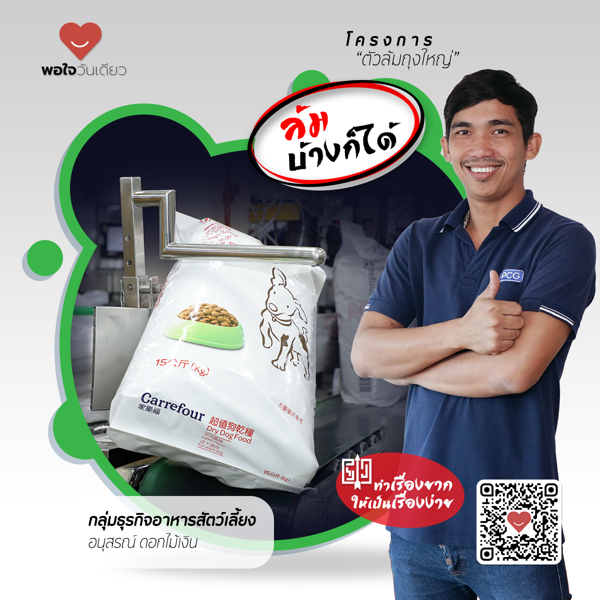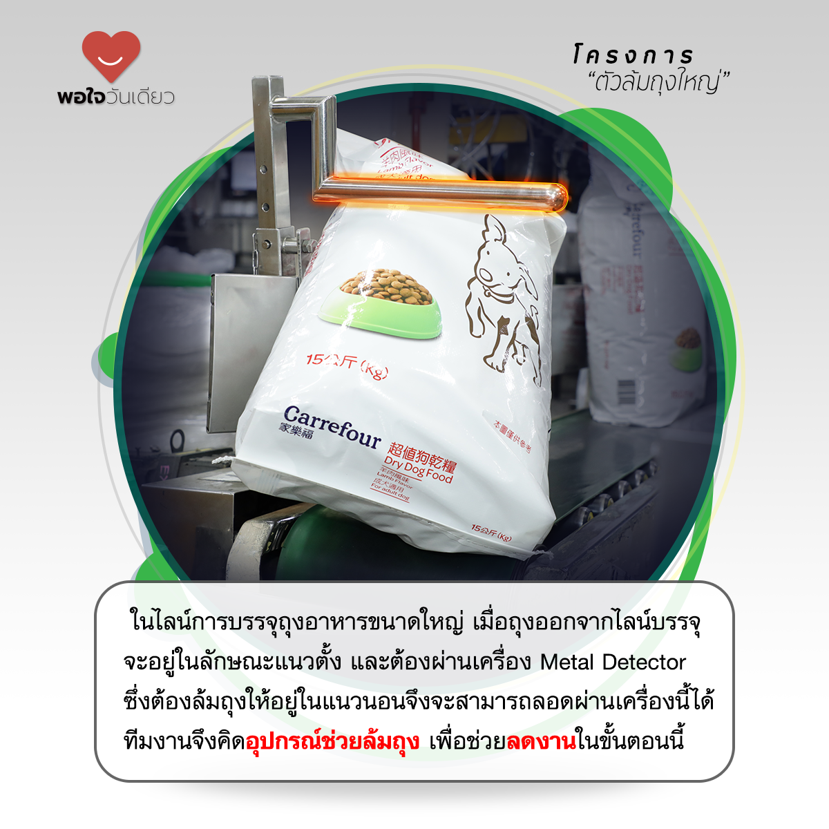 โครงการ “ตัวล้มถุงใหญ่” โดย กลุ่มธุรกิจ อาหารสัตว์เลี้ยง ในไลน์การบรรจุอาหารขนาดใหญ่ เมื่อถุงออกจากไลน์บรรจุจะอยู่ในลักษณะแนวตั้ง และต้องผ่านเครื่อง Metal Detector ซึ่งต้องล้มถุงให้อยู่ในแนวนอนจึงจะสามารถลอดผ่านเครื่องนี้ได้ ทีมงานจึงคิดอุปกรณ์ช่วยล้มถุงเพื่อช่วยลดงานในขั้นตอนนี้ ซึ่งเป็นการคิดค้นจากการทำงานในชีวิตประจำวัน เป็นการทำงานที่ช่วยให้ทำเรื่องยากให้เป็นเรื่องง่ายขึ้น หนึ่งในโครงการพอใจวันเดียว