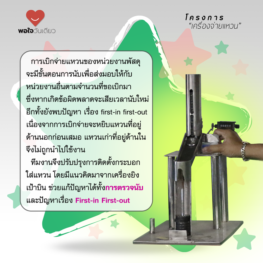 การเบิกจ่ายแหวนของหน่วยงานพัสดุจะมีขั้นตอนการนับเพื่อส่งมอบให้กับหน่วยงานอื่นตามจำนวนที่ขอเบิกมา ซึ่งหากเกิดข้อผิดพลาดจะเสียเวลานับใหม่อีกทั้งยังพบปัญหา เรื่อง first-in first-out เนื่องจากการเบิกจ่ายจะหยิบแหวนที่อยู่ด้านนอกก่อนเสมอ แหวนเก่าที่อยู่ด้านในจึงไม่ถูกนำไปใช้งาน ทีมงานจึงปรับปรุงการติดตั้งกระบอกใส่แหวน โดยมีแนวคิดมาจากเครื่องยิงเป้าบิน ช่วยแก้ปัญหาได้ทั้งการตรวจนับและปัญหาเรื่อง first-in first-out ทำให้การทำงานง่ายขึ้น สะดวกขึ้น และใช้แหวนได้ครบถ้วนด้วยวิธีจากการปรับปรุงงาน