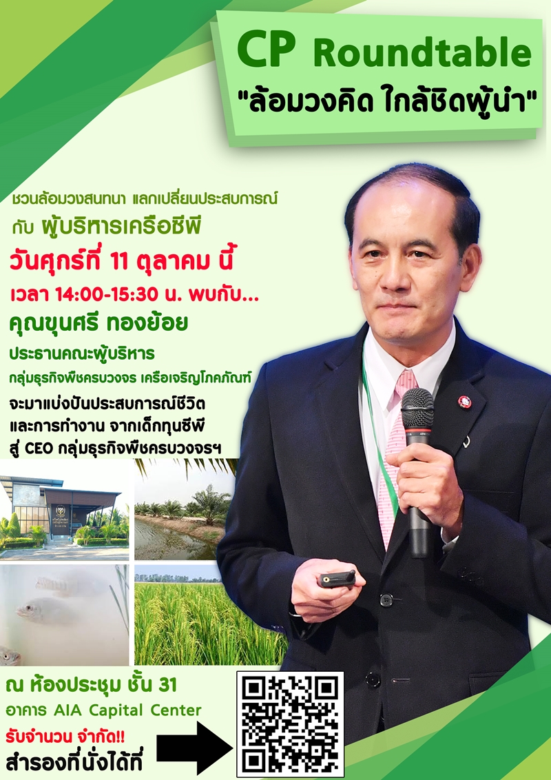 กิจกรรม CP Roudtable ล้อมวงคิด ใกล้ชิดพนักงาน ครั้งที่ 7 ได้รับเกียรติจากคุณขุนศรี ทองย้อย ประธานคณะผู้บริหาร กลุ่มธุรกิจพืชครบวงจร เครือเจริญโภคภัณฑ์ มาร่วมแบ่งปันประสบการณ์ชีวิต และการทำงานจากเด็กทุนซีพี สู่ CEO กลุ่มธุรกิจพืชครบวงจร ในวันศุกร์ที่ 11 ตุลาคม 2562 เวลา 14:00 – 15:30 น. ณ ห้องประชุม ชั้น 31 อาคาร AIA Capital Center ถ.รัชดาภิเษก ( MRT สถานีศูนย์วัฒนธรรม ทางออก )