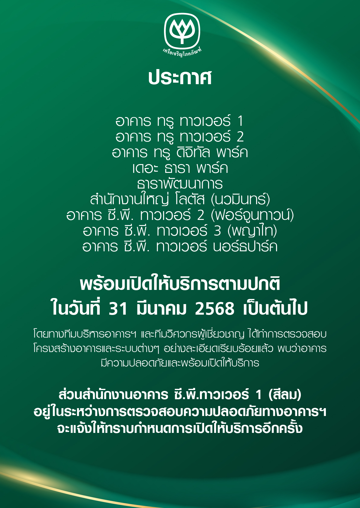 เครือเจริญโภคภัณฑ์ประกาศความพร้อมเปิดให้บริการอาคารสำนักงานใหญ่และอาคารธุรกิจหลักตามปกติ ตั้งแต่วันที่ 31 มีนาคม 2568 เป็นต้นไป หลังจากทีมบริหารอาคารฯ และทีมวิศวกรผู้เชี่ยวชาญได้ทำการตรวจสอบโครงสร้างและระบบต่าง ๆ อย่างละเอียด พบว่าอาคารมีความปลอดภัยและสามารถกลับมาใช้งานได้ตามปกติ