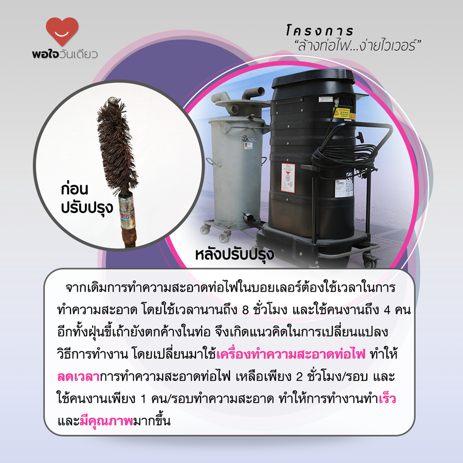 ในส่วนของรายะเอียดโครงการพอใจวันเดียวที่น่าสนใจก็คือ จากเดิมการทำความสะอาดท่อไฟในบอยเลอร์ต้องใช้เวลาในการทำความสะอาด โดยใช้เวลานานถึง 8 ชั่วโมง และใช้คนงานถึง 4 คน อีกทั้งฝุ่นขี้เถ้ายังตกค้างในท่อ จึงเกิดแนวคิดในการเปลี่ยนแปลงวิธีการทำงาน โดยเปลี่ยนมาใช้เครื่องทำความสะอาดท่อไฟ ทำให้ลดเวลาการทำความสะอาดท่อไฟเหลือเพียง 2 ชั่วโมง/รอบ และใช้คนงานเพียง 1 คน/รอบ ในการทำความสะอาด ทำให้การทำงานทำเร็วและมีคุณภาพมากขึ้น
