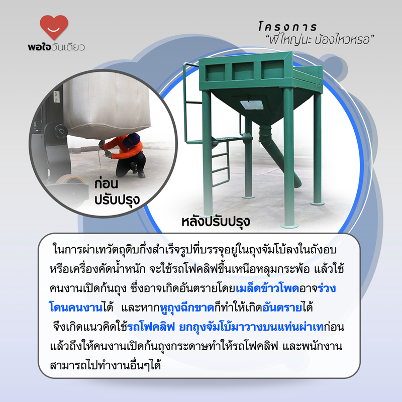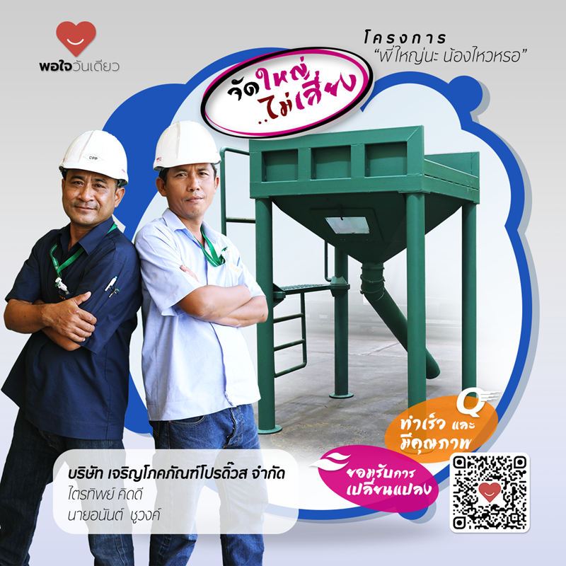 ช่วงนี้มีหลายผลงานที่ส่งเข้ามากับโครงการพอใจวันเดียว เรียกได้ว่าคณะกรรมการผู้ตรวจโครงการทำงานกันอย่างหนักเลยทีเดียว ซึ่งก็มีหลายโครงการที่น่าสนใจและคิดว่าอยากหยิบยกมาเล่าสู่กันฟังอีกสักครั้งกับโครงการที่เปิดตัวไปครั้งแรกบทความวันนี้เลยจะชวนมาคุยกับเจ้าของโครงการ “พี่ใหญ่นะ น้องไหวหรอ” โดยบริษัท เจริญโภคภัณฑ์โปรดิ๊วส จำกัด (โรงงานปรับสภาพเมล็ดพันธุ์) โรงงานข้าวโพด ซอย12 อีกหนึ่งผลงานของโครงการพอใจวันเดียว ได้นำเสนอวิธีการปรับปรุงงานจากการทำงานในชีวิตประจำวัน กับ 2ท่าน เจ้าของผลงานนี้ นั่นก็คือ คุณไตรทิพย์ คิดดี เจ้าหน้าที่ซ่อมบำรุง และคุณอนันต์ ชูงวงค์ เจ้าหน้าที่ผลิตเมล็ดพันธุ์