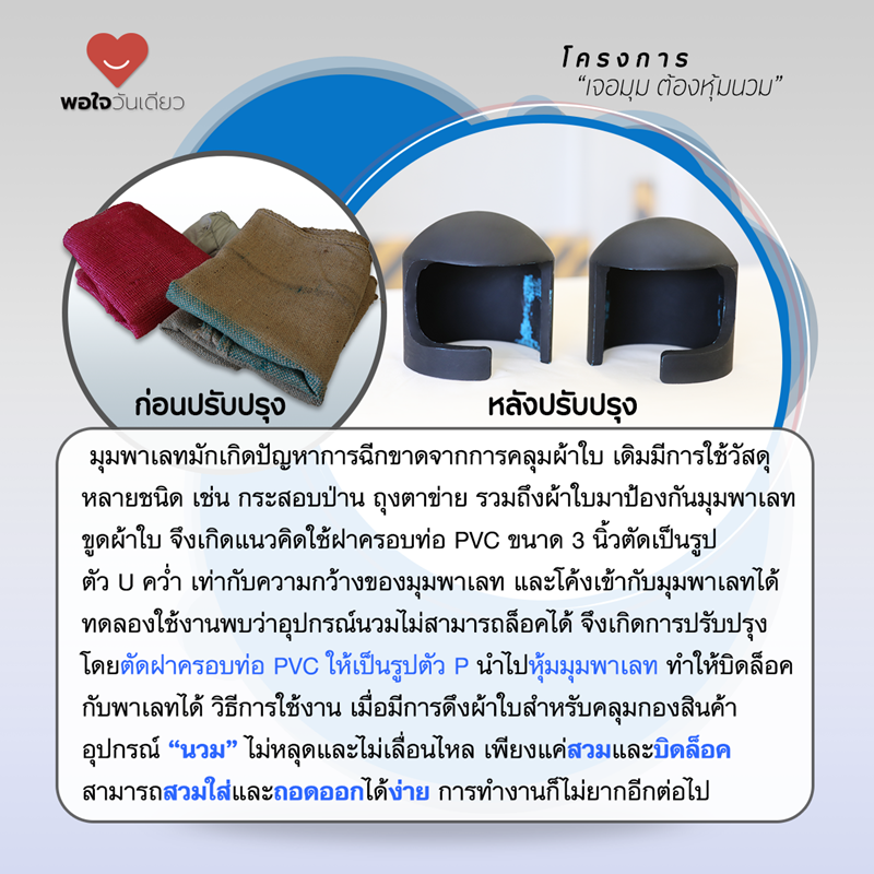 ในหน่วยงานคลังสินค้ามีพื้นที่ในการอบยาสินค้า จำเป็นต้องใช้ในส่วนของกระสอบป่าน ถุงตาข่าย หรือผ้า ในการหุ้มพาเลท ที่ขอบพาเลทมีลักษณะเป็นมุม เพื่อลดความฉีกขาดของผ้าคลุมพาเลท จึงเกิดไอเดียขึ้นมาว่าจะทำยังไงให้ในส่วนของอุปกรณ์ที่ใช้หุ้มมุมพาเลทไม่ให้ผ้าใบฉีกขาดค่ะ