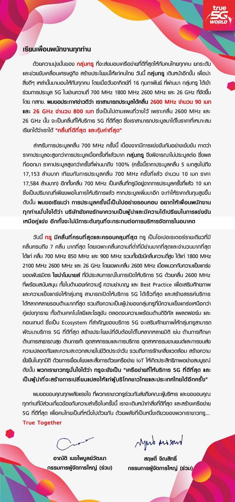 ด้วยความมุ่งมั่นของกลุ่มทรูที่จะส่งมอบเครือข่ายที่ดีที่สุดให้กับคนไทยทุกคน ยกระดับและช่วยขับเคลื่อนเศรษฐกิจ สร้างประโยชน์ให้แก่คนไทย วันนี้ กลุ่มทรู เดินหน้าอีกขั้น เพื่อนำสิ่งดีๆ เหล่านั้นมามอบให้กับทุกคน โดยเมื่อวันอาทิตย์ที่ 16 กุมภาพันธ์ ที่ผ่านมา กลุ่มทรูได้เข้าร่วมการประมูล 5G ในย่านความถี่ 700 MHz 1800 MHz 2600 MHz และ 26 GHz ที่จัดขึ้นโดย กสทช. ผมขอประกาศข่าวดีว่า เราสามารถประมูลได้คลื่น 2600MHz จำนวน 90 เมก และ 26GHz จำนวน 800 เมก ซึ่งเป็นไปตามแผนที่วางไว้ เพราะคลื่น 2600 MHz และ 26 GHz นั้น จะเป็นคลื่นที่ให้บริการ 5G ที่ดีที่สุด ซึ่งเราสามารถประมูลมาได้ในราคาที่เหมาะสม เรียกได้ว่าเราได้ “คลื่นที่ดีที่สุด และคุ้มค่าที่สุด”