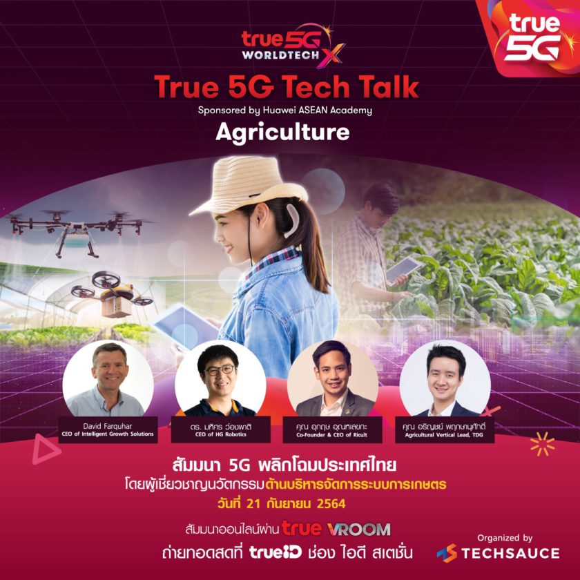 ภาคการเกษตรเป็นพื้นฐานของประเทศไทยมายาวนาน เมื่อสภาพแวดล้อมของโลกในมิติต่างๆเปลี่ยนแปลงไป จึงเป็นความท้าทายของเกษตรกรไทยที่ต้องปรับตัวสู่ยุคเกษตร 4.0 ทรู 5G ตอกย้ำผู้นำเครือข่ายที่ครอบคลุมครบ 77 จังหวัดทั่วไทย เสริมพลังเกษตรกรไทยในทุกๆภูมิภาคทรานส์ฟอร์มสู่เกษตรอัจฉริยะได้อย่างเต็มประสิทธิภาพ จับเทรนด์สมาร์ทฟาร์ม จัดสัมมนา 5G พลิกโฉมประเทศไทย “True 5G Tech Talk” ครั้งที่ 4 หัวข้อ “Agriculture” โดย ทรู 5G ร่วมกับ Huawei ASEAN Academy และ Techsauce ร่วมเปิดมิติแห่งนวัตกรรมด้านบริหารจัดการระบบการเกษตร ตอบโจทย์สมาร์ทฟาร์ม ผ่านมุมมองของผู้เชี่ยวชาญนวัตกรรมด้านบริหารจัดการระบบการเกษตรทั้งจากในและต่างประเทศ ได้แก่ มร.เดวิด ฟาร์คูร์ฮาร์ ประธานเจ้าหน้าที่บริหาร Intelligent Growth Solutions IGS แพลตฟอร์มที่มอบโซลูชันการทำเกษตรแนวตั้ง ให้ลูกค้าทั่วโลก ดร.มหิศร ว่องผาติ ประธานเจ้าหน้าที่บริหาร HG Robotics เทคสตาร์ทอัพชั้นนำของไทยที่เชี่ยวชาญด้านพัฒนาหุ่นยนต์และระบบอัตโนมัติรวมถึงโดรนเพื่อการเกษตร นายอุกฤษ อุณหเลขกะ ผู้ร่วมก่อตั้งและประธานเจ้าหน้าที่บริหาร บริษัท รีคัลท์ (ประเทศไทย) จำกัด แพลตฟอร์มดิจิทัลแบบบูรณาการที่ตอบสนองความต้องการของเกษตรกรและธุรกิจเกษตรแบบครบวงจร และนายอริญชย์ พฤกษานุศักดิ์ หัวหน้าธุรกิจเทคโนโลยีการเกษตร บริษัท ทรู ดิจิทัล กรุ๊ป จำกัด