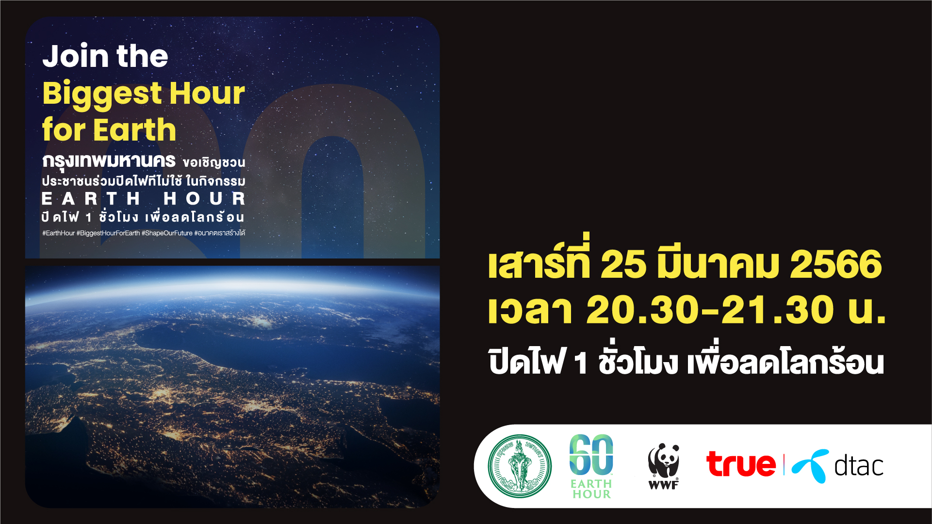 รวมพลังชาวทรู เพื่อโลกที่ดียิ่งกว่า..ชวนกันปิดไฟ 1 ชั่วโมง ลดโลกร้อนไปด้วยกัน กับกิจกรรม 60+ Earth Hour 2023 24 มีนาคม 2566SystemNews, กิจกรรมเพื่อสังคม, ซีพีเพื่อความยั่งยืน รวมพลังชาวทรู เพื่อโลกที่ดียิ่งกว่า..ชวนกันปิดไฟ 1 ชั่วโมง ลดโลกร้อนไปด้วยกัน กับกิจกรรม 60+ Earth Hour 2023 ในวันเสาร์ที่ 25 มีนาคม 2566 เวลา 20.30 – 21.30 น. Unite all True staff for a better planet…switch off the light for one hour to minimize global warning together with 60+Earth Hour 2023 activity on Saturday March 25th, 2023 during 8.30 pm-9.30 pm Post Views: 883