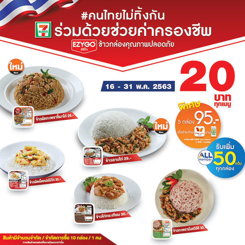 ข้าวกล่อง 20 บาทที่เซเว่น อีเลฟเว่น นำมาจำหน่ายในช่วงที่ผ่านมาตอบโจทย์ประชาชนในยุคCOVID-19 ลดค่าครองชีพทำให้หลายคนดำเนินชีวิตต่อไปได้ ล่าสุดเซเว่น อีเลฟเว่นได้ขยายเวลาจำหน่ายข้าวกล่องพร้อมรับประทานราคาพิเศษ เพียงกล่องละ 20 บาท ไปถึง 31 พฤษภาคม 2563 โดยเพิ่ม 2 เมนูใหม่ ได้แก่ ข้าวลาบไก่ และข้าวผัดกะเพราขี้เมาไก่ รวมกับเมนูเดิม ข้าวผัดเผ็ดหน่อไม้ไก่ ข้าวไก่กระเทียม ข้าวกะเพรามังสวิรัติ เป็น 5 เมนู เพื่อเป็นทางเลือกสำหรับรองรับความต้องการที่หลากหลายของผู้บริโภค