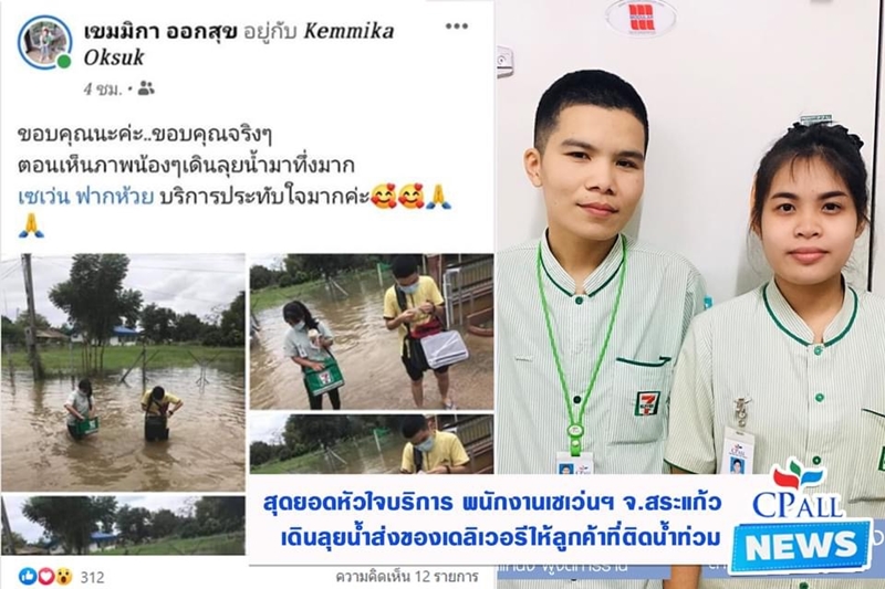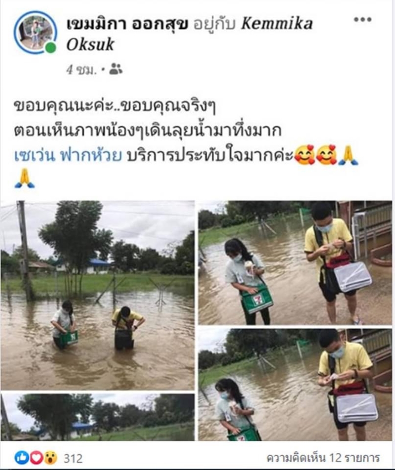 พนักงานเซเว่นฯ สาขาฟากห้วย (อรัญประเทศ)จ.สระแก้ว ลุยน้ำท่วมเข้าไปส่งของให้กับลูกค้าถึงที่บ้าน ลูกค้าตื้นตันในหัวใจบริการของน้องๆ แม้จะเป็นช่วงสถานการณ์อุทกภัยก็ตาม จนโพสต์ชื่นชมน้องในเพจ “กลุ่มลับ ชี้เป้าเซเว่น 7-11” เป็นกระแสในโลกโซเชียล