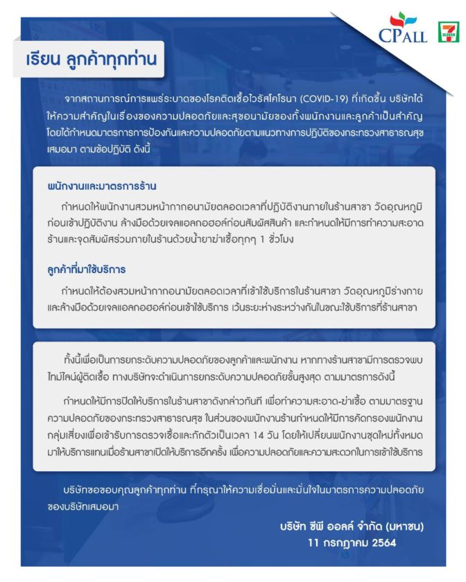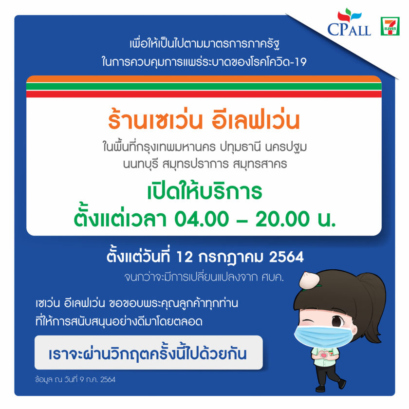 7-Eleven ได้ปรับเวลาเปิด-ปิดร้านในพื้นที่ควบคุมสูงสุด 6 จังหวัดตามมาตรการของ ศบค.จนกว่าจะมีประกาศเปลี่ยนแปลง พร้อมยกระดับป้องกันCOVID-19 ตามมาตรฐาน สธ.อย่างเข้มข้น