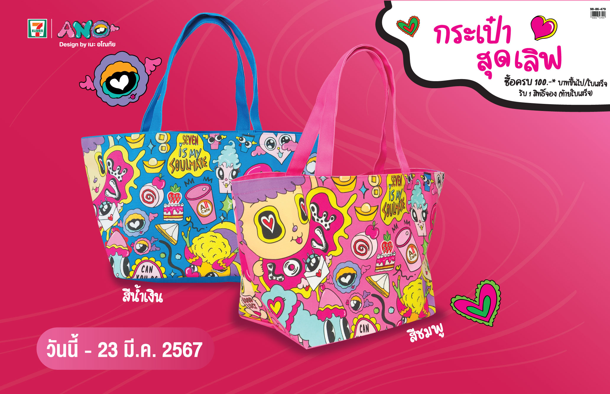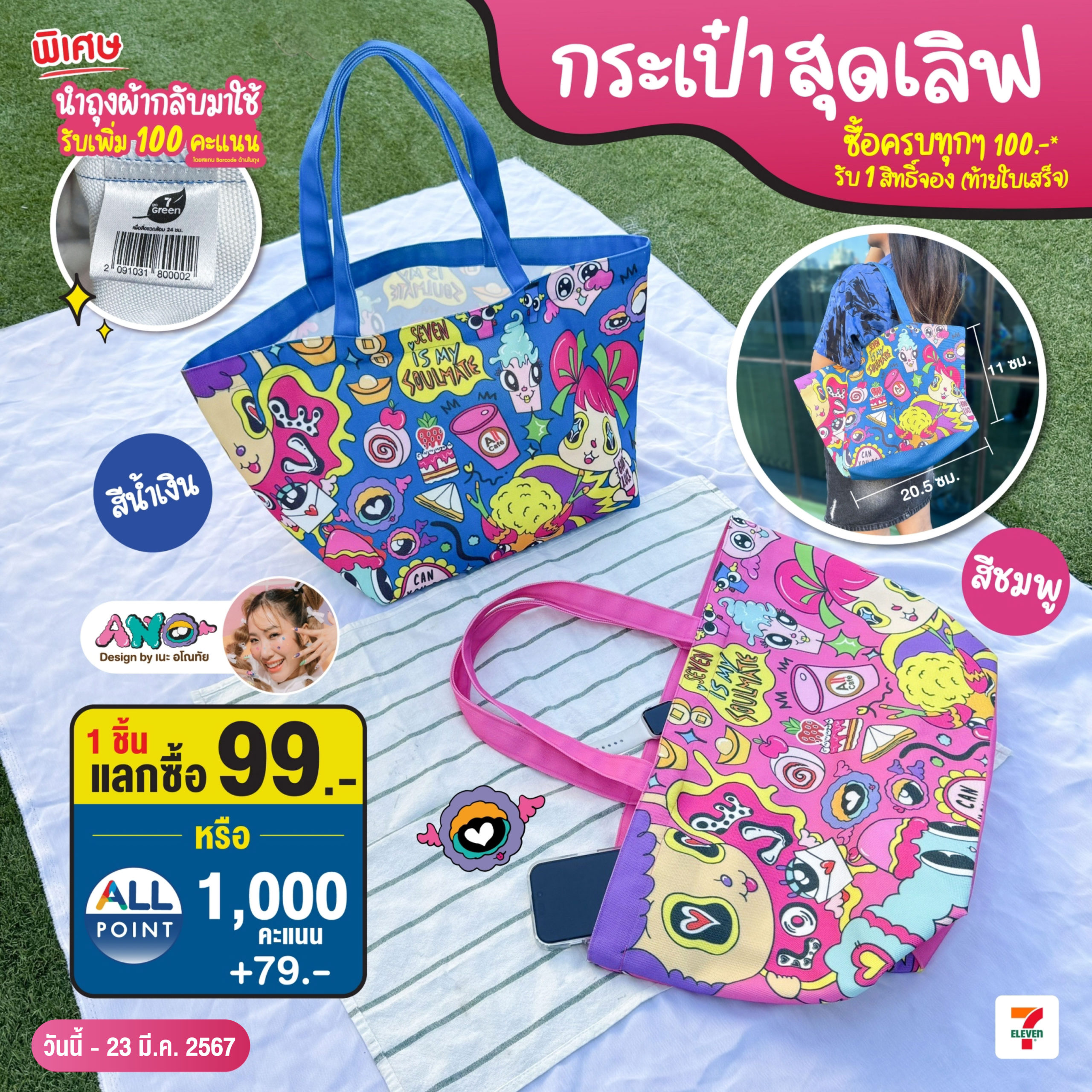 เซเว่น อีเลฟเว่น เปิดตัวกระเป๋าผ้าสุดเลิฟ ดีไซน์ บายด์ เนะ–อโณทัย เชิญชวนลูกค้ารักษ์โลก ใช้ถุงผ้าแทนถุงพลาสติก ภายใต้นโยบาย 7 Go Green เพื่อสิ่งแวดล้อม 24 ชั่วโมง ง่าย ๆ เพียง นำแต้มออลล์ เมมเบอร์ แลกกระเป๋าสุดเลิฟ โดยซื้อสินค้าครบ 100 บาท รับ 1 สิทธิ์จอง ท้ายใบเสร็จ ซึ่งมีให้สะสมทั้งหมด 2 แบบ จองได้ตั้งแต่วันนี้ – 23 มีนาคม 2567 เท่านั้น และพิเศษสำหรับสมาชิก ALL member เมื่อนำกระเป๋าสุดเลิฟกลับมาใช้ซ้ำภายในร้าน รับแต้มเพิ่มอีก 100 คะแนน ไปเล้ยยย!!!