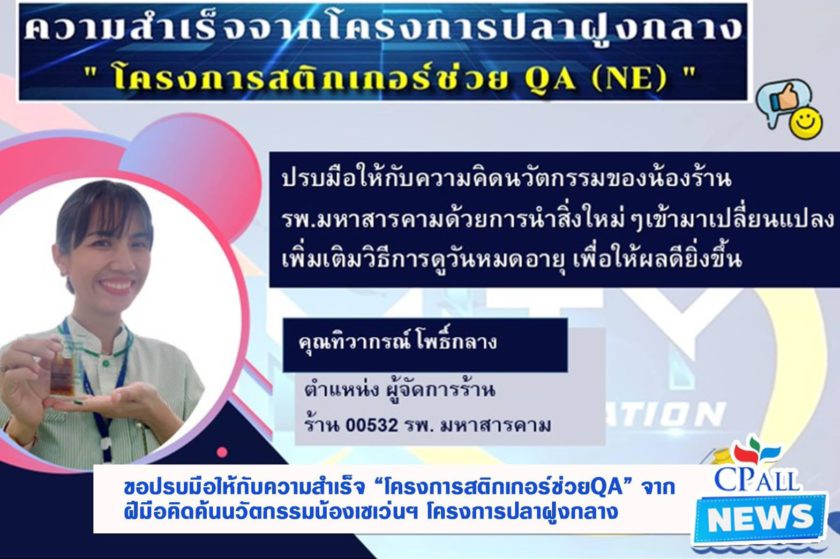 “โครงการสติกเกอร์ช่วยQA” จากพื้นที่ NE เป็นโครงการที่ใช้มุมคิดง่ายๆ ที่พลิกแพลงหรือปรับเปลี่ยนเพียงเล็กน้อย ก็ช่วยแก้ปัญหาในการทำงานได้ จากแนวคิดของน้องทิวากรณ์ โพธิ์กลาง ผู้จัดการร้านเซเว่น อีลฟเว่น สาขา รพ.มหาสารคาม (NE 00532) ที่ช่วยแก้ปัญหาที่ร้าน จากเดิมที่น้องๆ จะมองไม่เห็นวันหมดอายุที่พิมพ์บนซองซอสจิ๊กโฉ่ว เนื่องจากตัวอักษรวันหมดอายุที่พิมพ์ระบุไว้บนซองซอสเป็นสีดำ สีเดียวกับซอสจิ๊วโฉ่ว ทำให้มองไม่เห็นหรือมองเห็นยากมากๆ และเสียเวลาในการตรวจสอบ บางครั้งอาจจะทำให้ตัดจ่ายไม่หมด จากแนวคิดของน้องทิวากรณ์ ที่ให้น้องที่ร้านพิมพ์วันหมดอายุ ทำเป็นสติกเกอร์มาติดเพิ่มที่ซองซอส เพื่อให้มองเห็นวันหมดอายุได้ชัดเจนขึ้น จึงเกิดการพัฒนารูปแบบการพิมพ์วันหมดอายุบนซองซองรูปแบบใหม่ เปลี่ยนเป็นพื้นหลังสีเทาตัดกับสีซองและตัวอักษรวันหมดอายุ จึงทำให้มองเห็นวันหมดอายุได้ง่าย ลดระยะเวลาในการทำงานของร้านมากยิ่งขึ้น CP ALL NEWS ขอเสียงปรบมือให้กับแนวคิดในการปรับปรุงพัฒนางานของน้องๆ ที่ร้านสาขาด้วยค่ะ นับเป็นนวัตกรรมที่ต่อยอดและมาใช้งานได้อย่างแท้จริง