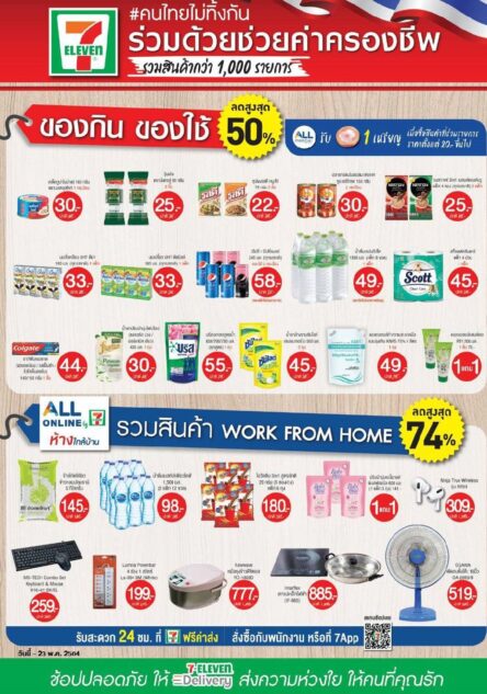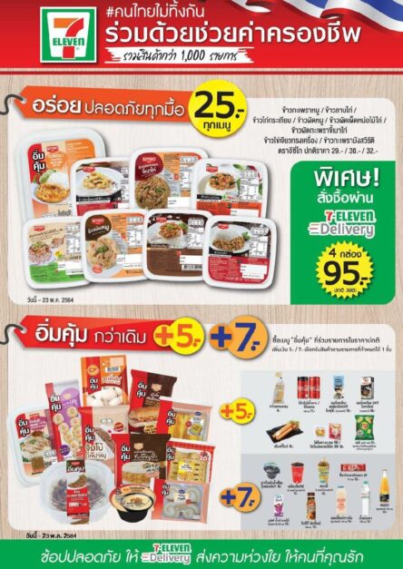 โควิด-19 จึงออกแคมเปญใหญ่ ‘เซเว่น อีเลฟเว่น ร่วมด้วยช่วยค่าครองชีพ’ ภายใต้โครงการ ‘คนไทยไม่ทิ้งกัน’ จับมือคู่ค้าลดราคาสินค้าอุปโภคบริโภค ส่งข้าวกล่อง 8 เมนู ปรับราคาเหลือเพียง 25 บาท ตั้งแต่วันที่ 24 เมษายน ถึง 23 พฤษภาคมนี้ พร้อมเพิ่มความสะดวกและปลอดภัยผ่านบริการ 7 Delivery จัดส่งสินค้าถึงบ้าน
