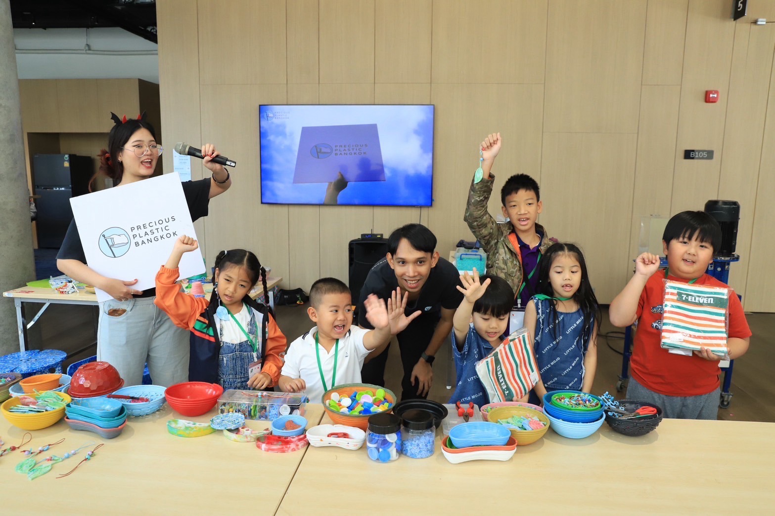 - ฐาน Key Chain Limited Edition : ร้อยพวงกุญแจ 7 Go Green รีไซเคิลจากฝาขวดพลาสติก โดย Precious Plastic BKK: NGO รุ่นใหม่ ซึ่งกิจกรรมนี้ น้อง ๆ ต้องนำฝาขวดน้ำมาแปรรูปเป็นวัสดุเพื่อใช้ประโยชน์กับชุมชน เปลี่ยนขยะพลาสติกเป็นลูกปัดหลากสี หลากสไตล์ เพื่อนำมาร้อยเป็นพวงกุญแจสุดเก๋ชิ้นเดียวในโลก ที่ให้น้อง ๆ ได้ออกแบบตามจินตนาการ ผสานงาน DIY กับกิจกรรมรักษ์โลก
