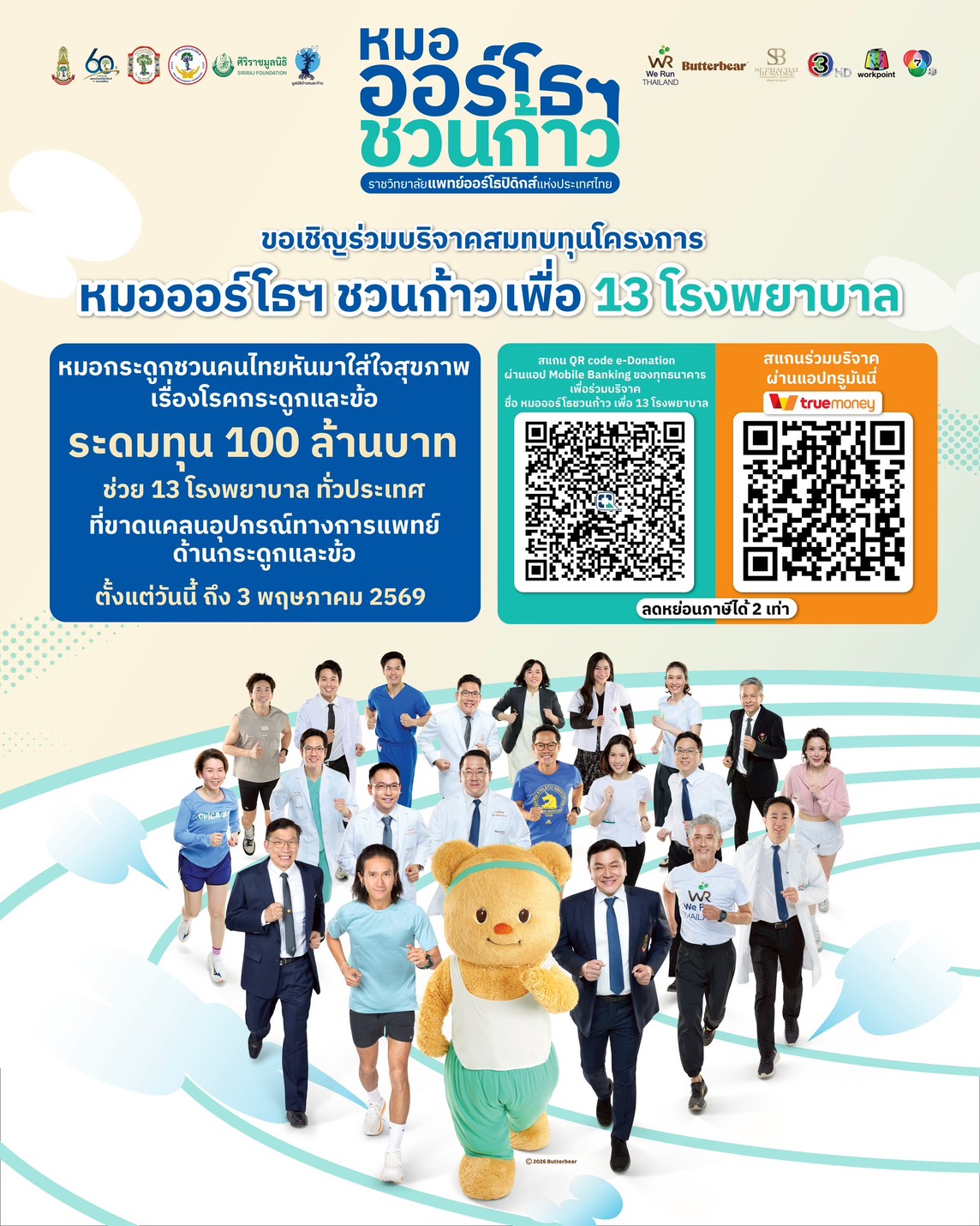 27 มีนาคม 2569, กรุงเทพฯ –  ท่ามกลางสถานการณ์ที่ผู้ป่วยโรคกระดูกและข้อในประเทศไทยเพิ่มขึ้นต่อเนื่องแตะราว 7 ล้านคน หรือคิดเป็น 10% ของประชากรไทย ขณะที่เทคโนโลยีทางการแพทย์สมัยใหม่ ซึ่งช่วยเพิ่มความแม่นยำในการรักษา ลดผลกระทบจากการผ่าตัด และส่งเสริมให้ผู้ป่วยฟื้นตัวได้เร็วขึ้น ยังมีต้นทุนสูงเกินกว่าที่โรงพยาบาลในภูมิภาคหลายแห่งจะเข้าถึงได้อย่างเพียงพอ โครงการ “หมอออร์โธฯ ชวนก้าว เพื่อ 13 โรงพยาบาล” ซึ่งจัดขึ้นโดยราชวิทยาลัยแพทย์ออร์โธปิดิกส์แห่งประเทศไทย ร่วมกับ มูลนิธิแพทย์ออร์โธปิดิกส์, ศิริราชมูลนิธิ มูลนิธิก้าวคนละก้าว มูลนิธิศุภชัย – บุษดี เจียรวนนท์ We Run THAILAND และน้องเนย (Butterbear) จึงเดินหน้าต่อเนื่องด้วยพลังความร่วมมือจากทุกภาคส่วน เพื่อเชิญชวนคนไทยร่วมดูแลสุขภาพของตนเองผ่านการเดิน-วิ่ง ควบคู่กับการร่วมบริจาคสมทบทุนจัดหาอุปกรณ์ทางการแพทย์ด้านกระดูกและข้อ อันจะช่วยเพิ่มโอกาสให้ผู้ป่วยทั่วประเทศเข้าถึงการรักษาได้อย่างทั่วถึง ทันท่วงที และมีคุณภาพชีวิตที่ดียิ่งขึ้น พร้อมตอกย้ำว่าการดูแลสุขภาพของตนเองสามารถแปรเปลี่ยนเป็นพลังแห่งการให้ เพื่อส่งต่อโอกาสในการรักษาแก่ผู้ป่วยที่ยังรอความช่วยเหลือใน 13 โรงพยาบาลทั่วประเทศ