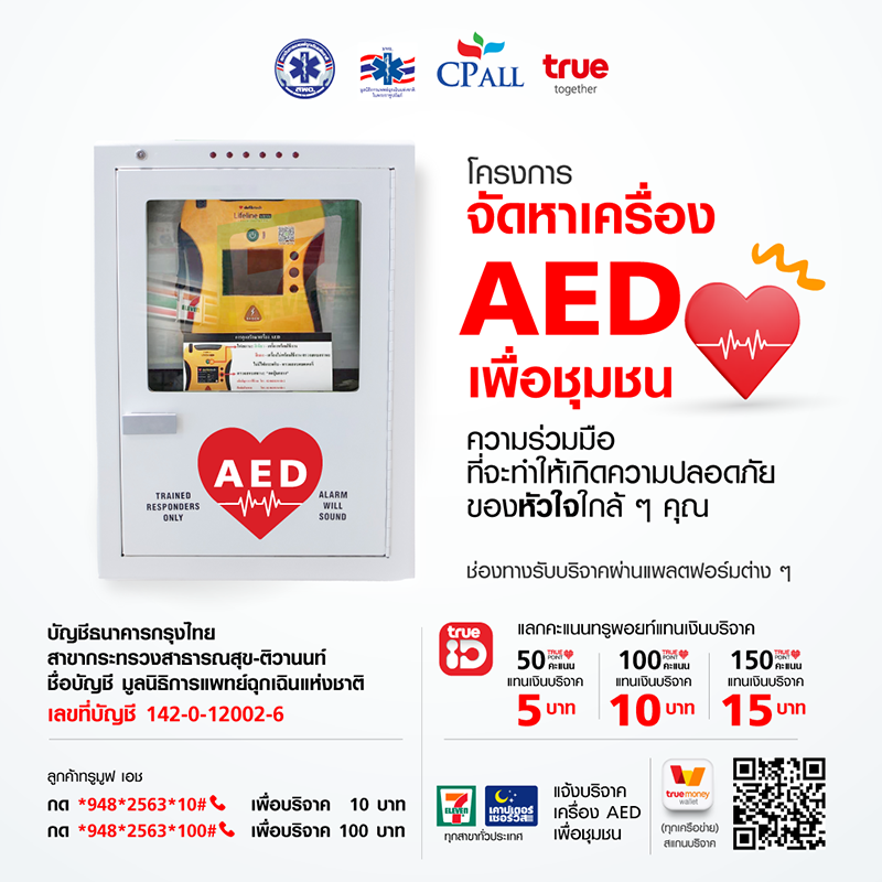 ♥️เพื่อความรวดเร็วในการช่วยเหลือเพิ่มโอกาสในการรอดชีวิต ขอเชิญชวนให้ร่วมเป็นส่วนหนึ่งกับ ‘โครงการจัดหาเครื่อง AED เพื่อชุมชน’ เพื่อวางไว้ภายในร้าน 7-11 ทั่วประเทศ ทำให้สามารถช่วยเหลือผู้ป่วยที่มีภาวะหัวใจหยุดเต้นเฉียบพลันได้ทันท่วงที