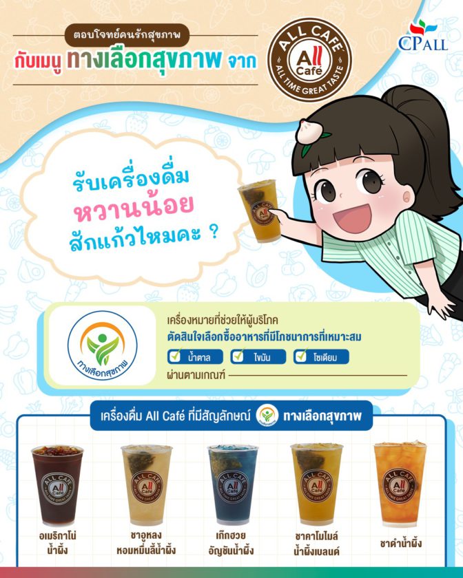สำหรับใครที่เข้า 7-Eleven บ่อยๆ จะต้องเคยลิ้มลองเครื่องดื่มต่างๆ ของ All Café อย่างแน่นอน ไม่ว่าจะเป็นกาแฟ ชา ช็อกโกแลต หรือสมูทตี้ก็ตาม แต่รู้ไหมว่าตอนนี้ All Café มีเครื่องดื่มที่ได้รับสัญลักษณ์ ‘ทางเลือกสุขภาพ’ ด้วยนะ เหมาะสำหรับผู้ที่รักสุขภาพแบบสุดๆ ไปเลย!