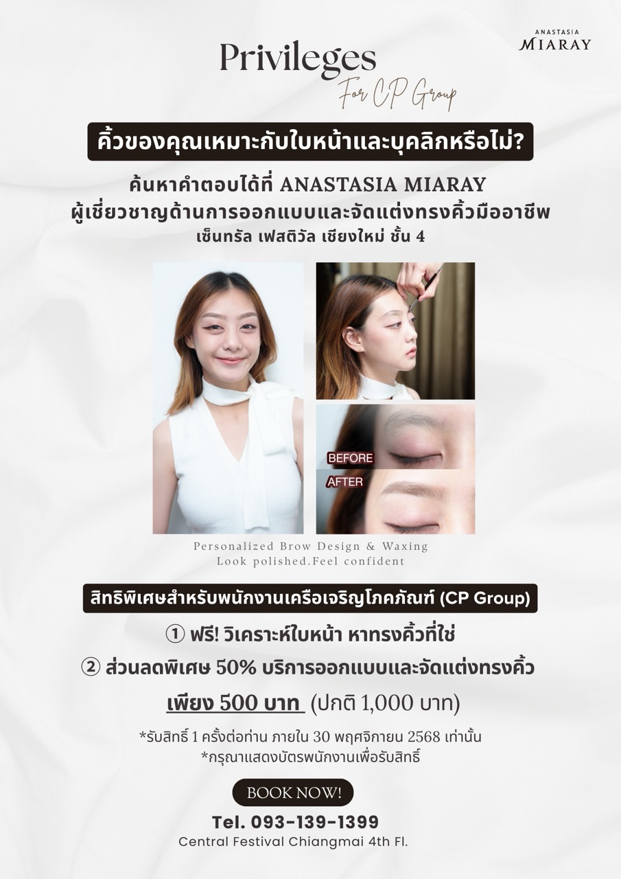 “ANASTASIA MIARAY” ผู้เชี่ยวชาญด้านการวิเคราะห์รูปหน้าและออกแบบทรงคิ้วโดยเฉพาะจากประเทศญี่ปุ่น ซึ่งมีสาขาในญี่ปุ่น และ 7 สาขาในไทย ขอมอบสิทธิพิเศษเพื่อสนับสนุนภาพลักษณ์ที่ดี และเพิ่มความมั่นใจให้กับพนักงานเครือเจริญโภคภัณฑ์ (CP Group) เนื่องในโอกาสครบรอบ 2 ปี ของสาขาเชียงใหม่ ดังนี้