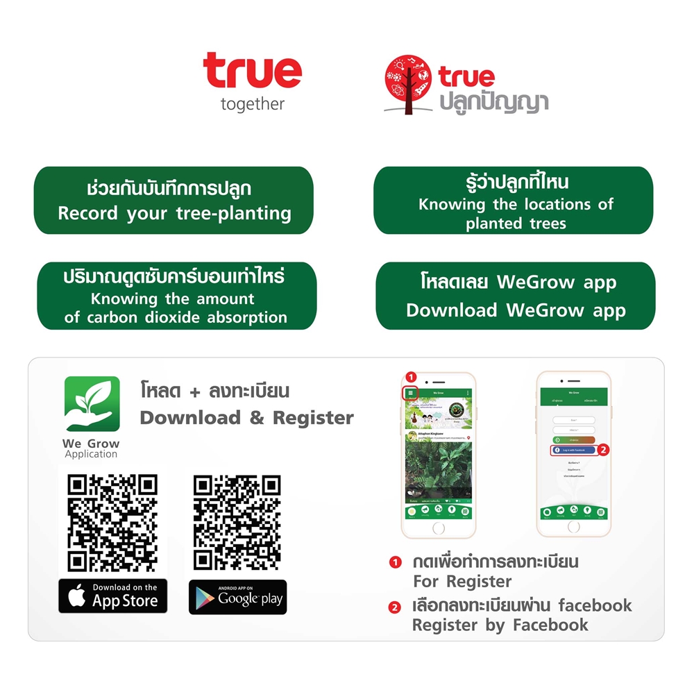 แอปพลิเคชั่น We Grow แอปฯ รักษ์โลก ที่พัฒนาโดยคนไทยอย่างแท้จริงโดย บริษัท ทรูคอร์ปอเรชั่น จำกัด (มหาชน) ซึ่งได้รับการสนับสนุนข้อมูลและองค์ความรู้เกี่ยวพรรณไม้ จากหลายหน่วยงาน อาทิ กรมส่งเสริมการเกษตร กรมอุทยานแห่งชาติฯ และกรมป่าไม้ปัจจุบันมีฐานข้อมูลการปลูกต้นไม้แล้วกว่า 4 ล้านต้น จากชาวไทยทั่วประเทศ ซึ่งเราอยากเชิญชวนให้คนไทยดาวน์โหลดแอปพลิเคชั่นดังกล่าว และร่วมกันปลูกต้นไม้ สร้างเครือข่ายคนรักต้นไม้เพื่อเป็นส่วนหนึ่งของปลูกจิตสำนึกการอนุรักษ์ธรรมชาติและสิ่งแวดล้อมผ่านสังคมออนไลน์