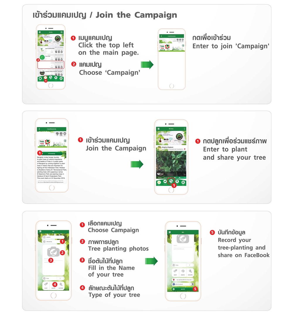 ผู้ใช้สามารถโพสต์ข้อมูลต้นไม้ที่ปลูก พิกัดสถานที่ปลูก และสถานะการเติบโตของต้นไม้ผ่านแอพ เพื่อติดตามการเติบโตและนับสถิติการร่วมลดภาวะโลกร้อน