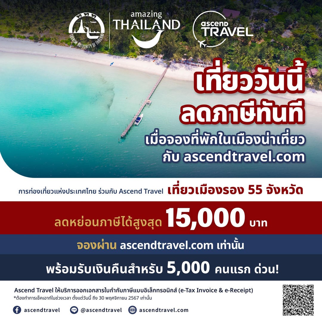 🥳 จองที่พักผ่าน Ascend Travel สามารถออกใบกำกับภาษีเพื่อนำไปลดหย่อนภาษีตามมาตรการส่งเสริมการท่องเที่ยวภายในประเทศ ช่วง Low Season คนเที่ยวเมืองรอง 55 จังหวัด สามารถหักภาษีเงินได้บุคคลธรรมดา สูงสุด 15,000 บาท!! ตั้งแต่วันนี้ – 30 พฤศจิกายน 2567