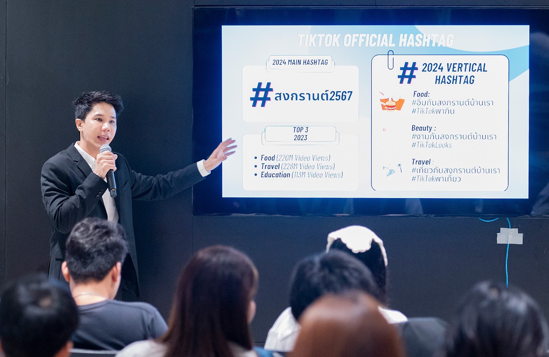 - “ไอซ์ ณภัทร ศิลาพันธ์” ผู้เชี่ยวชาญในการทำงานกับแบรนด์ระดับโลก จากเดอะเลมอนชอตในเครือเจริญโภคภัณฑ์ มาอัปเดตเทรนด์ Tiktok ช่วงสงกรานต์ ซึ่งจะมีคนใช้ Tiktok มากกว่า 100 นาที และนิยมซื้อสินค้าในช่วงนี้ โดยเฉพาะกลุ่มอาหารและเครื่องดื่ม รองลงมากลุ่มบิวตี้และเพอร์ซันนอลแคร์ ตามด้วยกลุ่มเครื่องใช้ไฟฟ้า ปิดท้ายด้วยกลุ่มแฟชั่นและแอ็กเซสซอรี่ โดยต้องเน้นทำคอนเทนต์ให้สนุก น่าติดตาม และสินค้าต้องน่าสนใจ ที่สำคัญอย่าลืมติดแฮชแท็ค #สงกรานต์2567