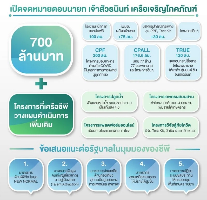 เมื่อวันที่ 1 พฤษภาคม ประธานธนินท์ เจียรวนนท์ ประธานอาวุโส เครือเจริญโภคภัณฑ์ ได้ทำจดหมายตอบกลับ พล.อ.ประยุทธ์ จันทร์โอชา นายกรัฐมนตรีและรัฐมนตรีว่าการกระทรวงกลาโหม มีใจความว่า