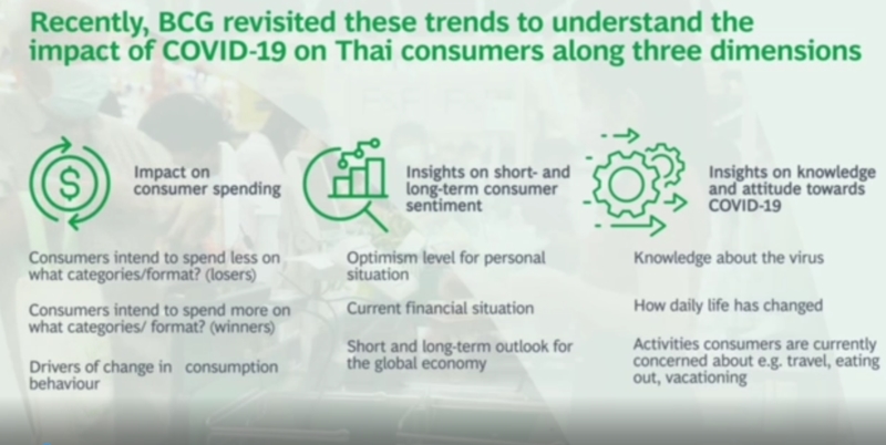 ทั้งนี้ BCG ระบุว่า ในช่วงหลายเดือนที่ผ่านมาได้สำรวจพฤติกรรมผู้บริโภคกว่า 35,000 คนใน 20 ประเทศ รวมทั้งประเทศไทยในช่วงสถานการณ์โควิด-19 พบ 5 พฤติกรรมผู้บริโภคที่มีผลอย่างชัดเจน คือ 1) ผู้บริโภคอยู่กับบ้าน และมีการ Work from Home มากขึ้น แม้ว่าจะมีการลดข้อบังคับแล้วก็ตาม 2) การเติบโตอย่างก้าวกระโดดของช่องทางออนไลน์ 3) ผู้บริโภคมีการตัดค่าใช้จ่ายฟุ้มเฟือยต่างๆ 4) ผู้บริโภคให้ความสำคัญต่อเรื่องสุขภาพเป็นอย่างมาก มีลัษณะ Health is the New Wealth และ 5) แม้ว่าผู้บริโภคจะใช้บริการร้านค้าปลีกน้อยลงโดยรวม แต่ร้านค้าขนาดเล็กได้รับความนิยมเป็นอย่างมาก เนื่องจากผู้บริโภคต้องการหลีกเลี่ยงคนจำนวนมาก