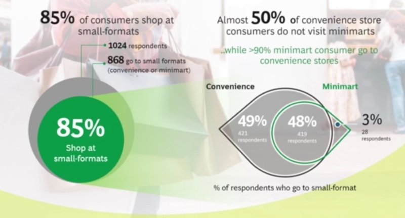 ในรายงานการสำรวจของ BCG ยังชี้ให้เห็นว่า จากการวิจัยกับผู้บริโภคกว่า 1,000 ราย และพูดคุยกับผู้ให้บริการ กว่า 80% ของกลุ่มตัวอย่างได้ไปซื้อของที่ร้านค้าปลีกอย่างน้อย 1 ครั้ง ในช่วงระยะเวลา 2 เดือนที่ผ่านมา เกือบครึ่งหนึ่งของผู้ใช้บริการจะไม่ไปร้านมินิมาร์ท แต่ในทางกลับกันผู้ที่ใช้บริการร้านมินิมาร์ทแทบทุกคนก็ยังไปใช้บริการร้านสะดวกซื้อร่วมด้วย อย่างไรก็ตามพบว่า ผู้บริโภคมีทัศนคติต่อร้านค้าทั้งสองประเภทแตกต่างกัน