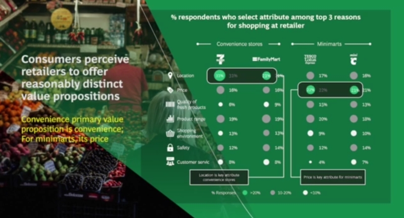 โดย BCG รายงานว่า ได้ทำการศึกษากับกลุ่มตัวอย่างเพื่อให้เข้าใจผู้บริโภคมากขึ้น ซึ่งเห็นได้ชัดว่าร้านค้าปลีกขนาดเล็กทั้ง 2 ประเภทนี้ตอบโจทย์ผูบริโภคที่แตกต่างกัน