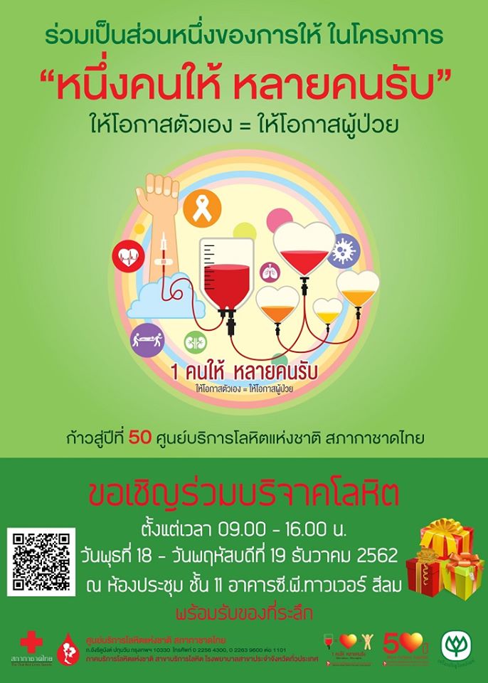 มีข่าวบอกบุญมาฝากชาวซีพี สืบเนื่องจากเครือเจริญโภคภัณฑ์จัดให้มีการบริจาคโลหิตต่อเนื่องในโครงการ “เครือเจริญโภคภัณฑ์มุ่งสู่ 100 ปี ทำความดีด้วยการบริจาคโลหิต” และก้าวสู่ปีที่ 50 ปีศูนย์บริการโลหิตแห่งชาติ สภากาชาดไทย โดยในปี2562 มีเป้าหมายจัดหาโลหิตให้ได้ 3,000 ยูนิต หรือจำนวน 1,200,000 ซี.ซี. ซึ่งในช่วง3ไตรมาสที่ผ่านมาเครือฯได้จัดกิจกรรมรับบริจาคโลหิตไปแล้ว 3 ครั้งและเครือฯมีกำหนดที่จะรับบริจาคโลหิตครั้งที่4 ประจำปี2562 โดยศูนย์บริการโลหิตแห่งชาติ สภากาชาดไทยจะมารับบริจาค ในวันพุธที่ 18 และวันพฤหัสบดีที่ 19 ธันวาคม 2562 เวลา 8:30-16:00 น. ณ ห้องประชุม ชั้น 11 อาคารซี.พี.ทาวเวอร์ ถนนสีลม