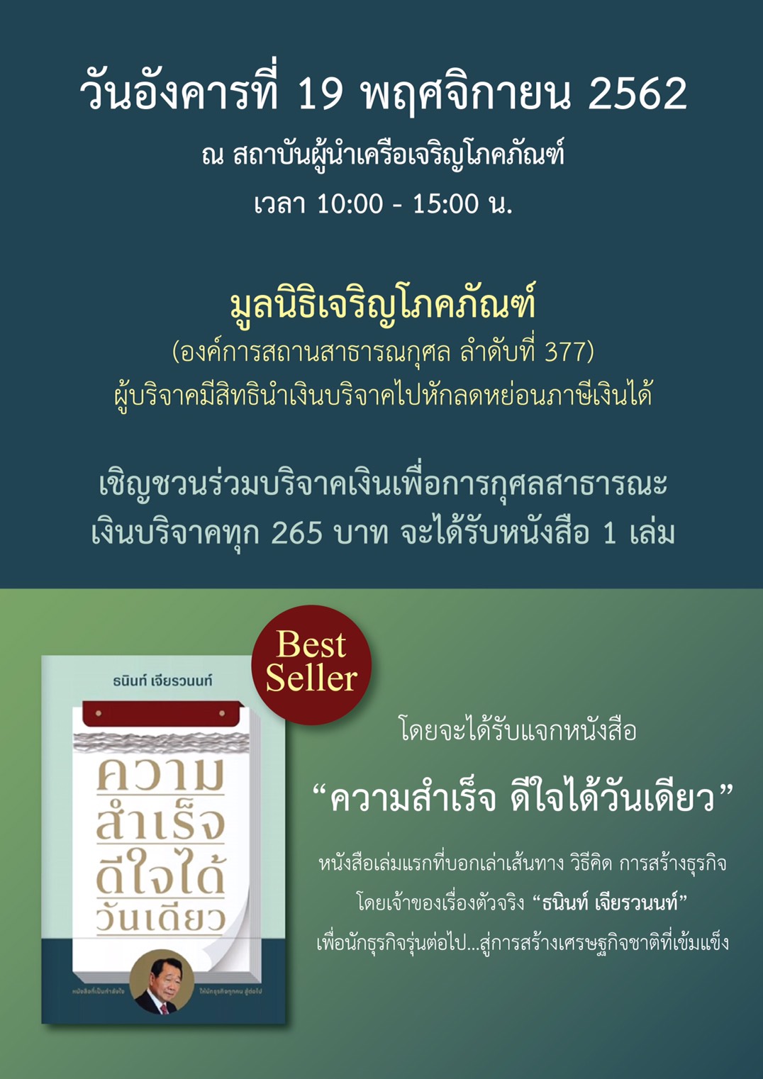 พบกันวันอังคารที่ 19 พย. นี้ ณ สถาบันผู้นำเครือเจริญโภคภัณฑ์ มูลนิธิเจริญโภคภัณฑ์เชิญชวนร่วมบริจาคเพื่อสาธารณะกุศล คนละ 265 บาท โดยจะได้รับแจกหนังสือ ”ความสำเร็จ ดีใจได้วันเดียว” คนละ 1 เล่ม 16 พฤศจิกายน 256217 พฤศจิกายน 2019Systemกิจกรรมเพื่อสังคม Post Views: 1,586