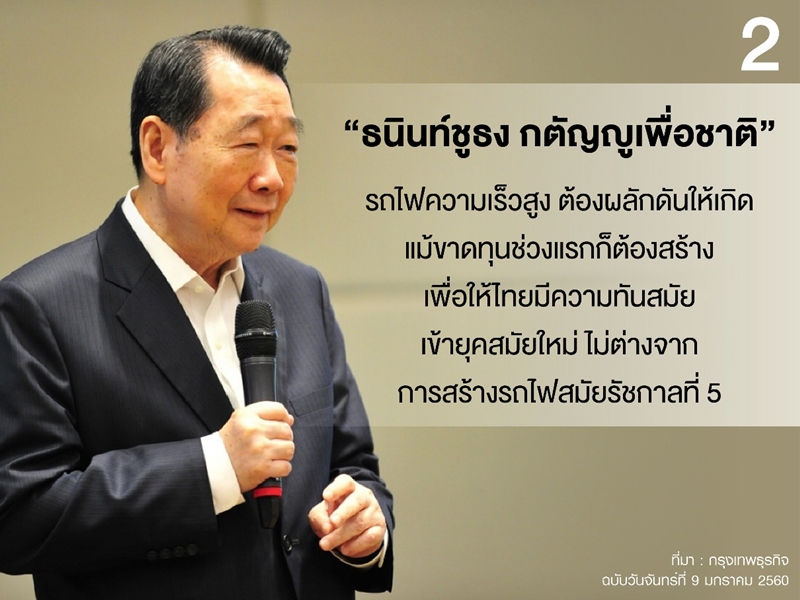 ท่านประธานอาวุโส กล่าวด้วยว่า รัชกาลที่ 5 ได้ทรงสร้างรถไฟมาแล้วสี่พันกิโลเมตร หลังจากนั้นมีการสร้างรถไฟเพิ่มขึ้นอีกเพียงสองร้อยกว่ากิโลเมตร ครั้งนี้จึงถือว่าเป็นประวัติศาสตร์ที่จะสานต่อโครงสร้างพื้นฐาน ซึ่งมีความพิเศษตรงที่ จีนกับญี่ปุ่นจับมือร่วมกันทำรถไฟความเร็วสูงเป็นครั้งแรก จึงถือเป็นอีกหนึ่งความสำเร็จในการช่วยกันคิดช่วยกันทำ ประสานประโยชน์เพื่อแผ่นดินไทย ซีพีทำธุรกิจในประเทศไทย บนแผ่นดินของพระมหากษัตริย์ จึงมีหน้าที่ต้องตอบแทนบุญคุณแผ่นดิน ดังนั้นต้องทำโครงการนี้ให้สำเร็จ ไม่ใช่ไปรับมาแล้วทำไม่สำเร็จ ก็จะกลายเป็นภาระของประเทศ เมื่อรับมาแล้ว เราต้องทุ่มเททั้งกำลังกาย จิตใจ มันสมอง ทำให้โครงการนี้สำเร็จให้ได้