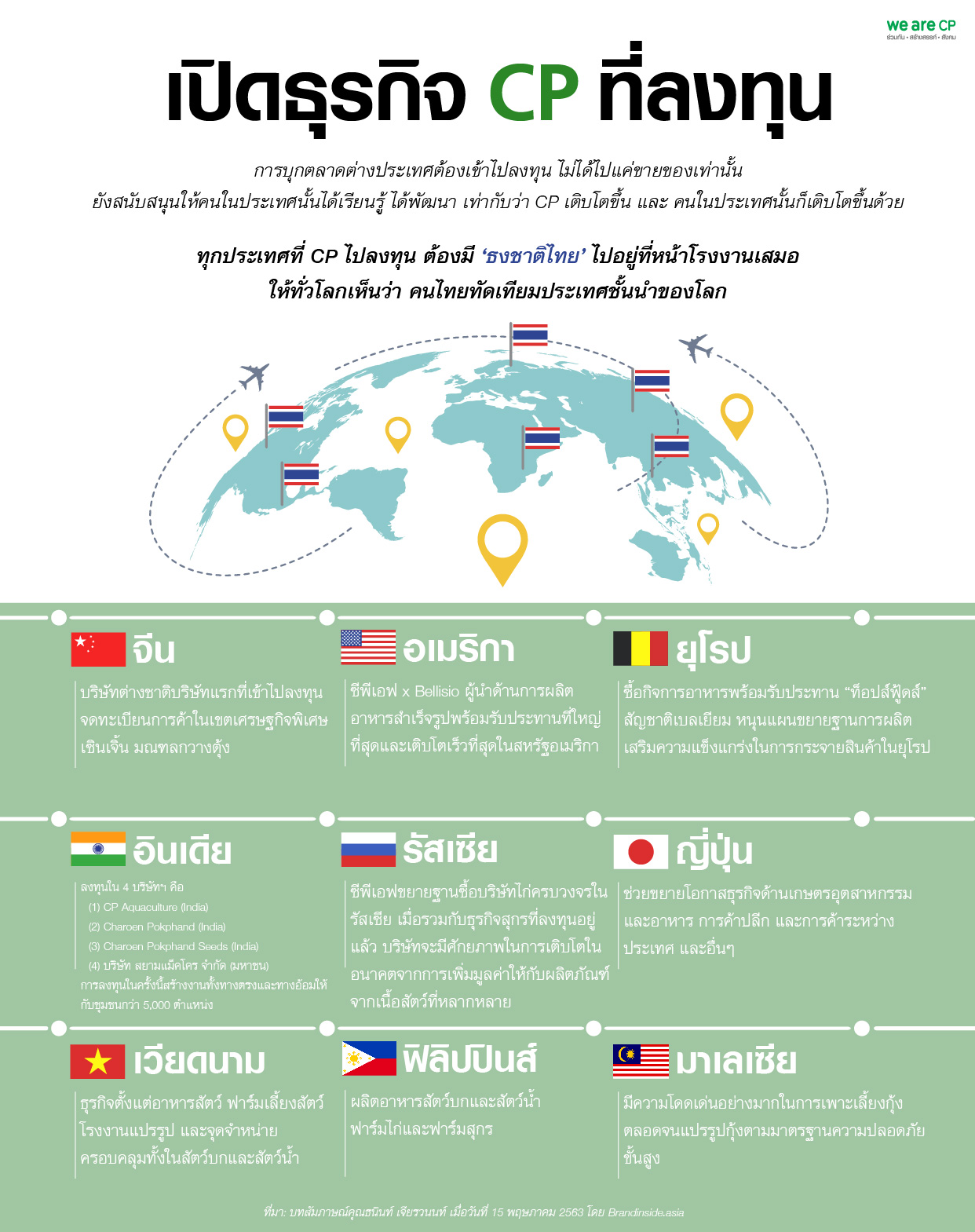 เมื่อวันที่ 15 พฤษภาคม 2563 ทีมงาน Brandinside asia ได้มีโอกาสสัมภาษณ์ ท่านประธานธนินท์ เจียรวนนท์ ประธานอาวุโส เครือเจริญโภคภัณฑ์ โดยท่านประธานอาวุโสเปิดเผยว่า CP เป็นบริษัทที่ลงทุนกว่า 20 ประเทศ ทำตลาดกว่า 100 ประเทศทั่วโลก เพราะเป็นธุรกิจอาหารและการเกษตรจึงสามารถไปได้ทุกแห่ง และสามารถสร้างรายได้ส่วนใหญ่ 60-70% ของบริษัทมาจากต่างประเทศ และมีแนวโน้มมากขึ้นเรื่อยๆ