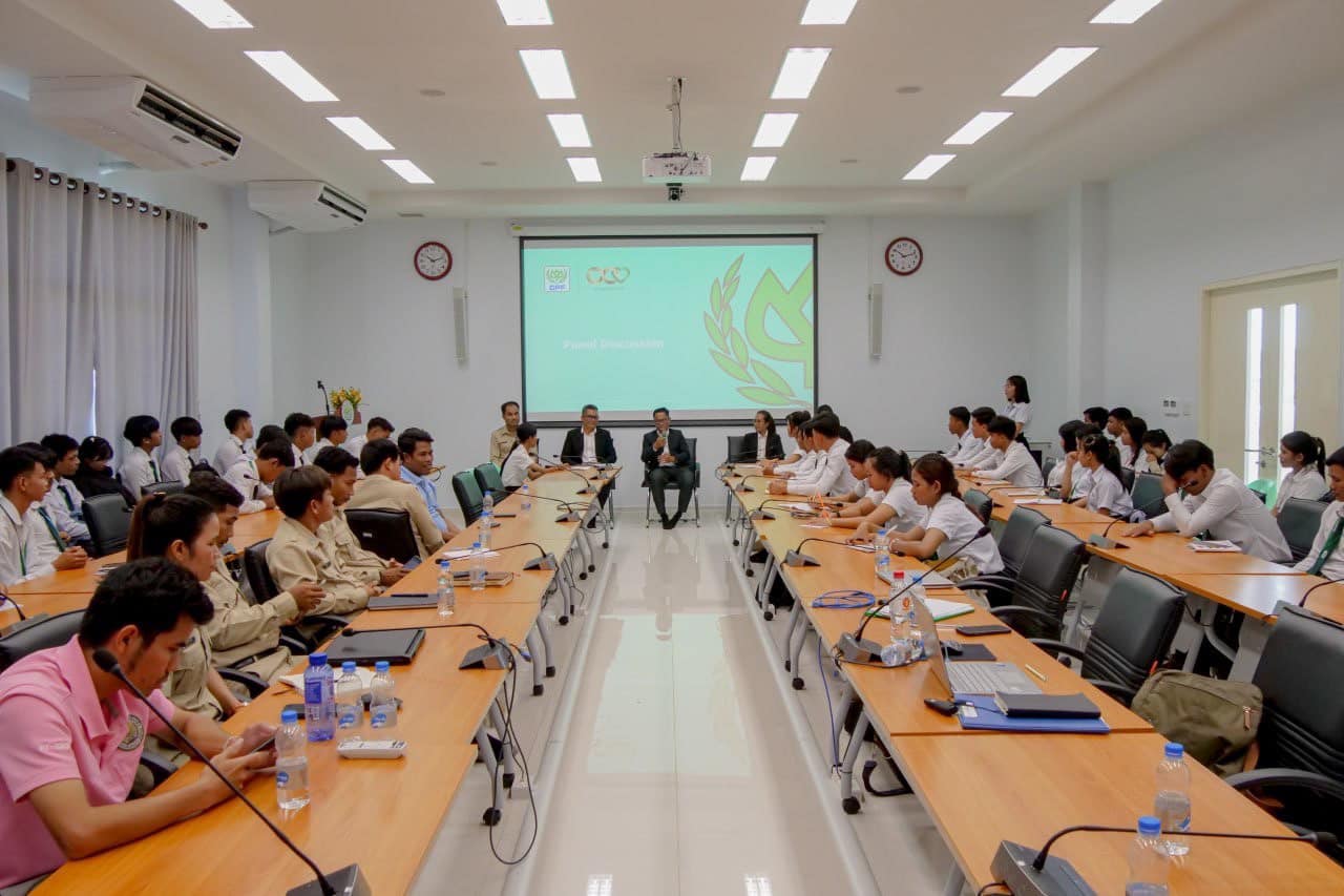 CP กัมพูชา จัดกิจกรรมทัวร์มหาวิทยาลัย ‘โครงการ Campus Visit’ พาพนักงานจากฟาร์มไก่เนื้อ ฟาร์มสุกร และสายงานต่างๆ มาแนะแนวให้คำแนะนำประสบการณ์การทำงาน รวมทั้งทักษะที่จำเป็นแก่น้องๆ นักศึกษา สถาบันเทคโนโลยีกำปงสปือ โดยมี คุณเขม เขน ผู้จัดการฟาร์มไก่เนื้อ และ คุณแสง จันทู ผู้จัดการฟาร์มสุกร เป็นวิทยากร ร่วมแบ่งปันความรู้การเตรียมความพร้อมสู่การฝึกงาน เทคนิคดีๆ สู่ความสำเร็จ พร้อมทั้งการสัมภาษณ์นักศึกษา ที่สมัครขอเข้าฝึกงานกับบริษัทฯ ด้วย ‘CP กัมพูชา’ มีเป้าหมายพบปะน้องๆ เยาวชน เพื่อสร้างแรงบันดาลใจสู่สายอาชีพด้านเกษตรอุตสาหกรรมและอาหาร มุ่งมั่นพัฒนาคนรุ่นใหม่ให้เป็นคนดี คนเก่ง ที่คุณภาพสู่ตลาดงานของกัมพูชาต่อไป
