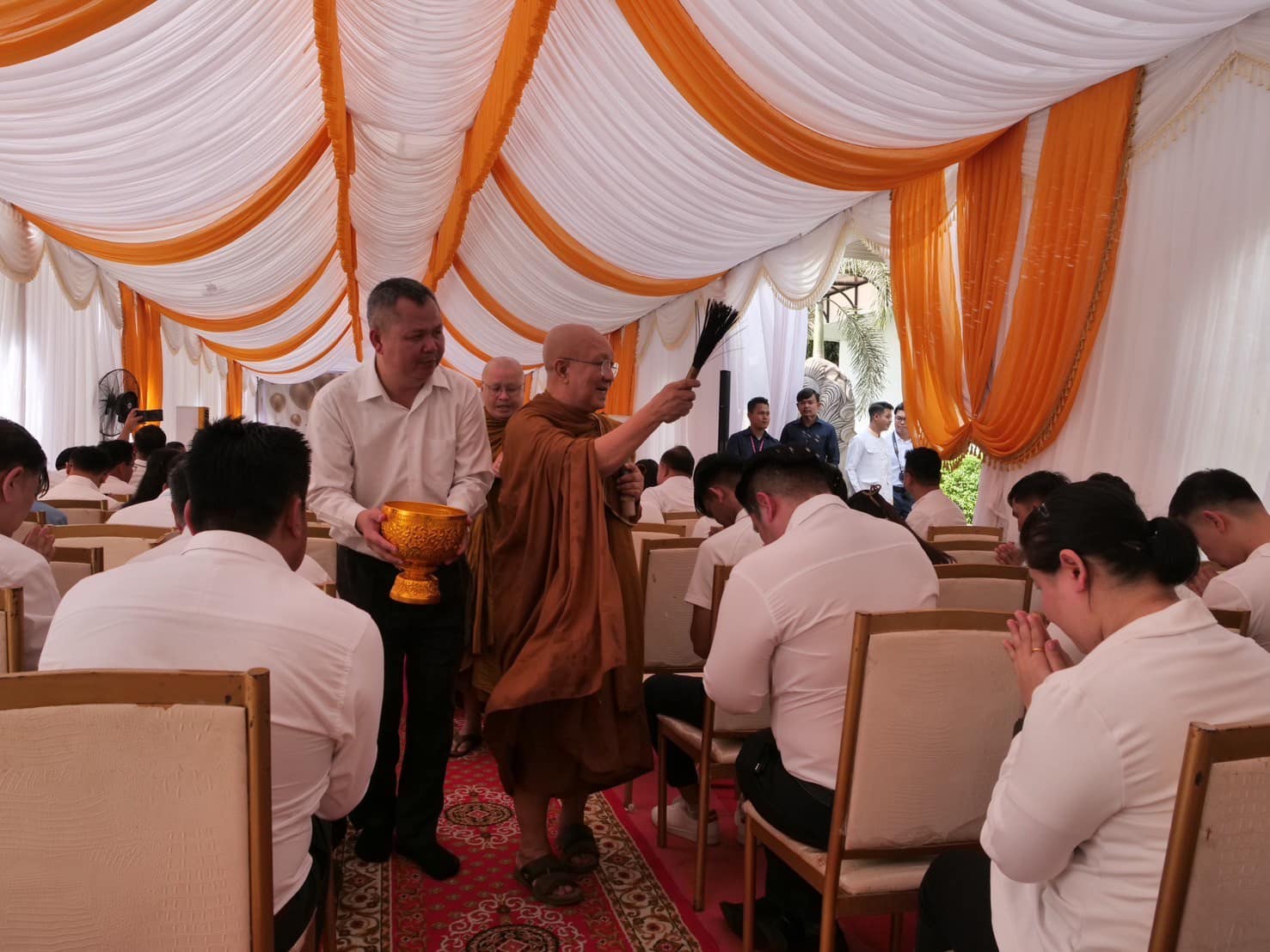 พร้อมกันนี้ สมเด็จพระสังฆราชกัมพูชา ได้ประทานสัมโมทนียกถา เพื่อเป็นคติธรรมและเป็นสิริมงคลในการบริหารกิจการของ ซี.พี. กัมพูชา จากนั้น ได้ประพรมน้ำพระพุทธมนต์ เพื่อความเป็นสิริมงคล ยังความปลาบปลื้มปิติโสมนัสแก่คณะผู้บริหารและพนักงานเป็นอย่างยิ่ง
