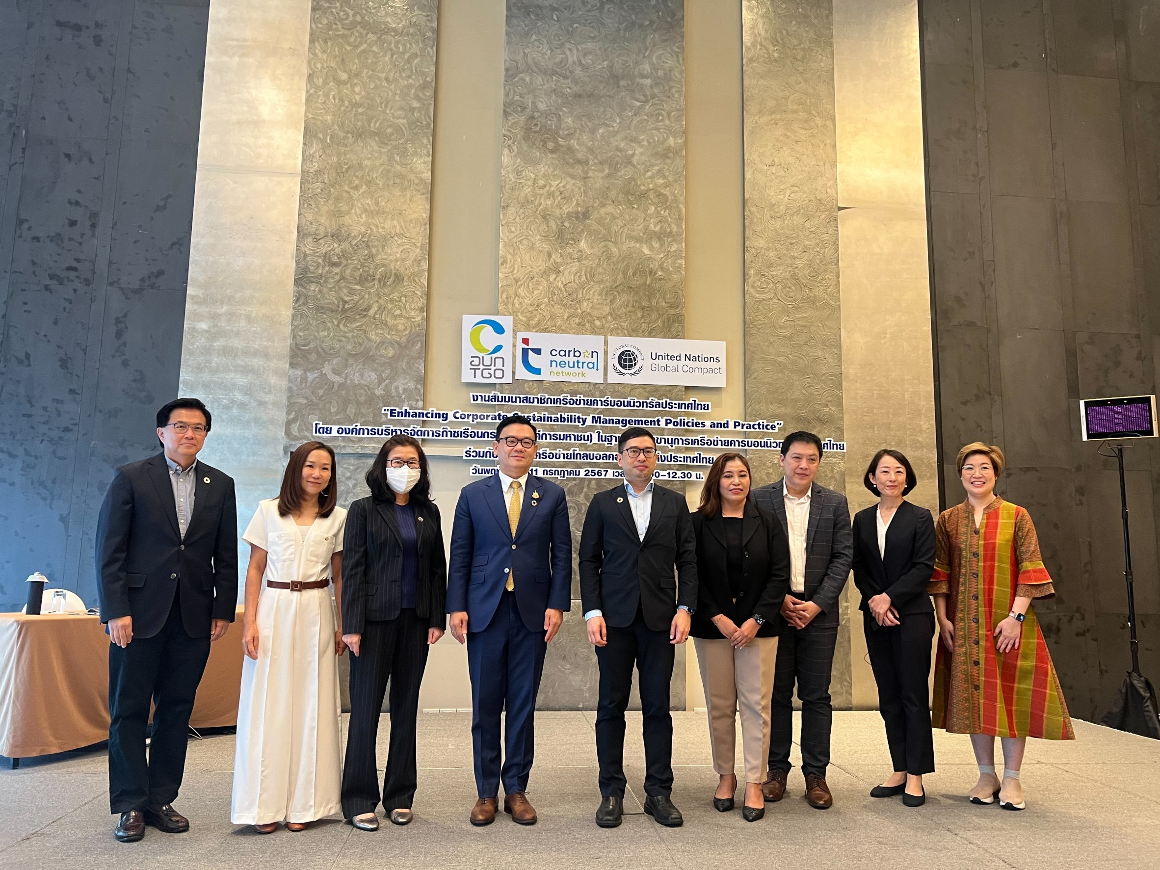 11 กรกฎาคม 2567 สมาคมเครือข่ายโกลบอลคอมแพ็กแห่งประเทศไทย (United Nations Global Compact Network Thailand, UNGCNT) ร่วมกับ องค์การบริหารจัดการก๊าซเรือนกระจก (Thailand Greenhouse Gas Management Organization, TGO) และ เครือข่ายคาร์บอนนิวทรัลประเทศไทย (Thailand Carbon Neutral Network, TCNN) จัดงานสัมมนา Enhancing Corporate Sustainability Management Policies and Practice ณ โรงแรมพูลแมน คิงเพาเวอร์ กรุงเทพ เพื่อสร้างความรู้ ความเข้าใจ และเป็นเวทีแลกเปลี่ยนเรียนรู้ให้กับองค์กรสมาชิกเครือข่ายฯ เกี่ยวกับความสำคัญของการบริหารจัดการองค์กร และการเปิดเผยข้อมูลด้านความยั่งยืน ซึ่งถือเป็นเครื่องมือสำคัญในการบริหารจัดการความเสี่ยง และการกำหนดแนวทางกำกับดูแลกลยุทธ์ ตัวชี้วัด และเป้าหมายในการรับมือต่อการเปลี่ยนแปลงสภาพภูมิอากาส โดยในงานสัมมนานี้มีบริษัทจากกลุ่มอุตสาหกรรมต่าง ๆ รวมถึง สถาบันการเงิน สถาบันวิจัยกว่าให้ความสนใจเข้าร่วมจำนวนกว่า 150 ราย