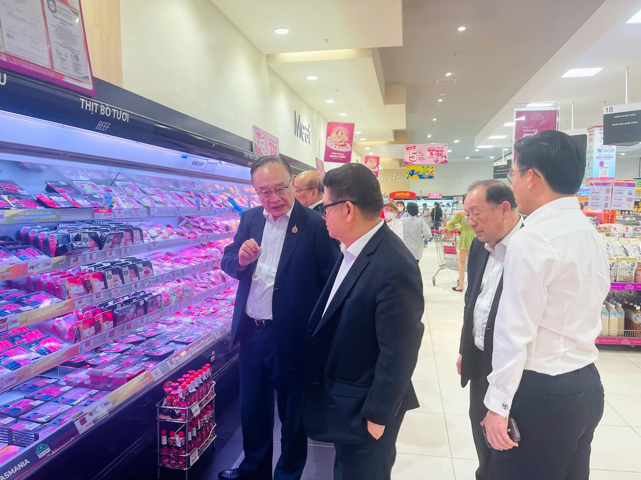 นอกจากนี้ คุณอดิเรกยังได้เยี่ยมชมซูเปอร์มาร์เก็ต Aeon ซึ่งเป็นพันธมิตรด้านการจัดจำหน่ายของ ซี.พี.เวียดนาม เพื่อตรวจสอบคุณภาพและประเมินผลิตภัณฑ์ พร้อมทั้งให้คำแนะนำแก่ทีมพัฒนาผลิตภัณฑ์ในด้านนวัตกรรมที่ตอบสนองความต้องการของผู้บริโภคยุคใหม่ การเยือนครั้งนี้เป็นการยืนยันถึงความมุ่งมั่นของ ซี.พี.เวียดนาม ในการนำเทคโนโลยีและนวัตกรรมมาประยุกต์ใช้ในการผลิต เพื่อมุ่งสู่อนาคตที่ยั่งยืน