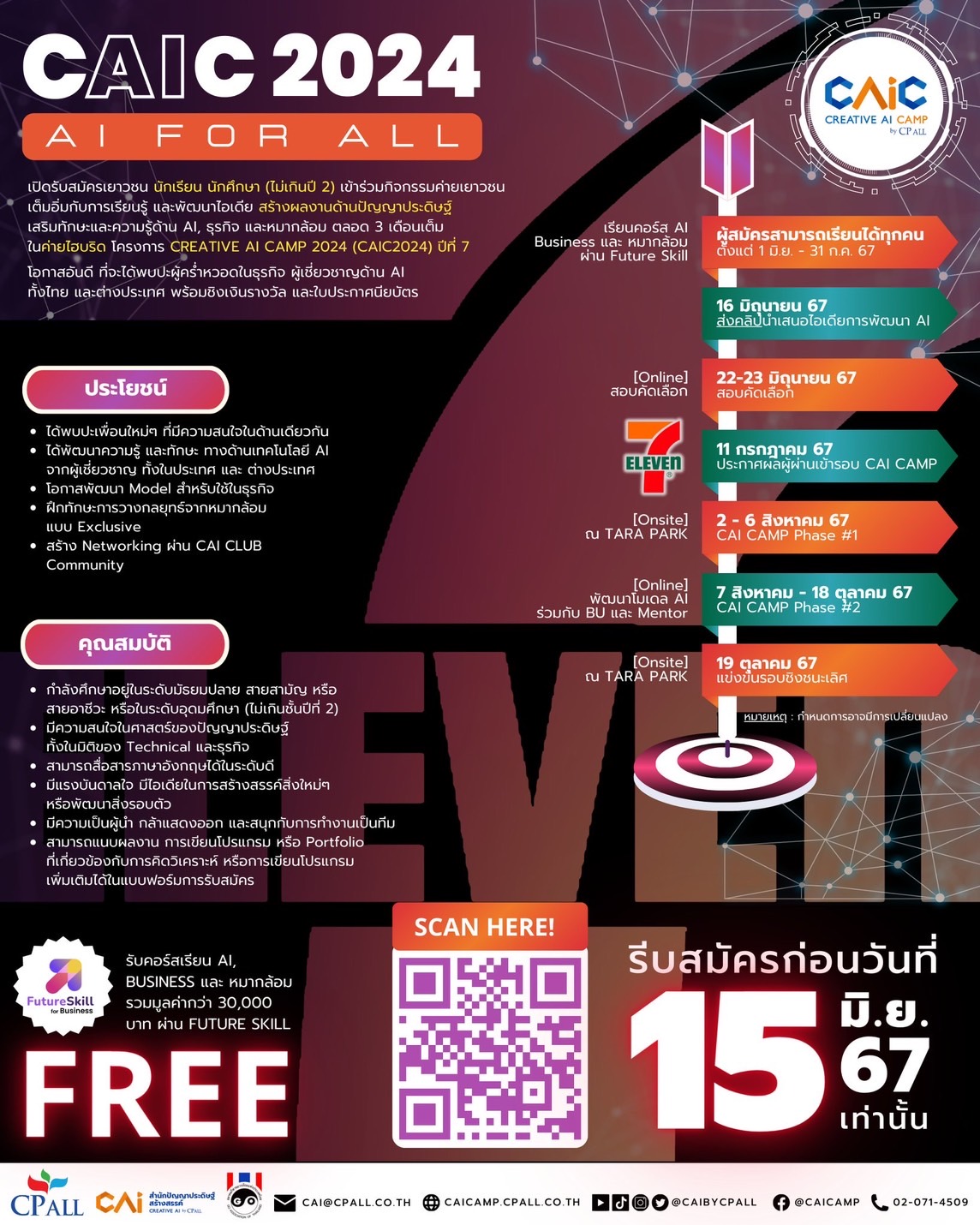 พลาดไม่ได้! ปีนี้ซีพี ออลล์ฉลองการจัดค่ายปีที่ 7 จัดเต็มรางวัลมากมาย ประกาศนียบัตร และประสบการณ์สุดล้ำที่รอให้น้องๆ มาสัมผัส และพิเศษสุดๆ! เพียงแค่สมัครก็รับสิทธิ์เข้าคอร์สเรียนออนไลน์ AI, BUSINESS และหมากล้อมฟรี! มูลค่ารวมกว่า 30,000 บาท  ผ่านแพลตฟอร์ม Future Skill