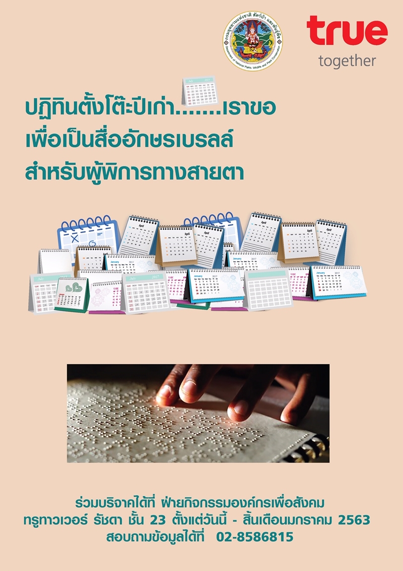 หน่วยงาน CSR True เป็นตัวแทนรับบริจาคปฏิทินตั้งโต๊ะปีเก่า เพื่อนำไปทำเป็นสื่ออักษรเบรลล์ ที่ใช้ในการเรียนการสอน สำหรับผู้พิการทางสายตา ตั้งแต่วันนี้ – มกราคม 2563
