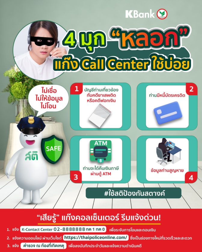คุณกฤษณ์ จิตต์แจ้ง กรรมการผู้จัดการ ธนาคารกสิกรไทย เปิดเผยว่า จากสถานการณ์แก๊งคอลเซ็นเตอร์ที่ใช้วิธีหลอกลวงได้แยบยลและดูน่าเชื่อถือมากขึ้น หลอกเหยื่อทางโทรศัพท์ สร้างสถานการณ์ให้ตื่นตระหนก หรือหลอกล่อด้วยเงินรางวัลต่างๆ ทำให้มีจำนวนผู้ตกเป็นเหยื่อ และสูญเสียทรัพย์ไปเป็นจำนวนมาก โดยกลโกงของแก๊งคอลเซ็นเตอร์ที่มักแอบอ้างเป็นธนาคารคือ โทรแจ้งว่าลูกค้าติดหนี้บัตรเครดิต และขอให้ลูกค้ารีบชำระเงินโดยด่วนด้วยการโอนเงินเข้ามายังบัญชีที่หลอกลวง