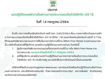 CPF ประกาศ ขยายเวลา Work From Home เพื่อป้องกันและการเฝ้าระวังโควิด-19 จนถึงวันที่ 31 ก.ค. 64