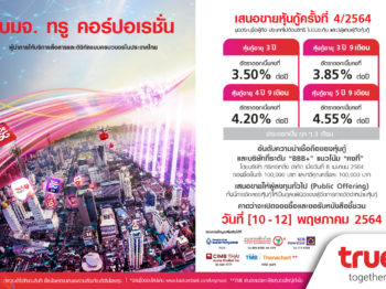 ทรู เผยอัตราดอกเบี้ยหุ้นกู้ครั้งที่ 4/2564 จำนวน 4 ชุดระหว่าง 3.50-4.55% ต่อปี เตรียมเปิดให้ผู้ลงทุนทั่วไปจองซื้อ 10-12 พฤษภาคม 2564