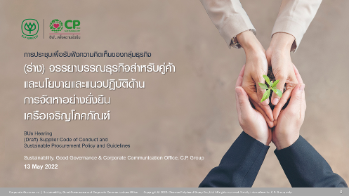 นอกจากนี้เครือฯ ยังได้ดำเนินการทบทวนจรรยาบรรณธุรกิจสำหรับคู่ค้า เพื่อเป็นแนวปฏิบัติให้กับคู่ค้าที่จะร่วมทำธุรกิจกับเครือฯ และจัดทำนโยบายและแนวปฏิบัติด้านการจัดหาอย่างยั่งยืน เครือเจริญโภคภัณฑ์ขึ้น เพื่อเป็นแนวปฏิบัติในการจัดหาอย่างยั่งยืนที่สอดคล้องตามมาตรฐานทั้งไทยและสากล โดยจัดประชุมรับฟังความคิดเห็นเมื่อวันที่ 13 พฤษภาคม 2565 และมีผู้เข้าร่วมประชุมทั้งสิ้น 113 ท่านจากทุกกลุ่มธุรกิจ ซึ่งการจัดประชุมรับฟังความคิดเห็นทั้ง 2 ครั้งได้รับคำแนะนำและข้อเสนอแนะที่เป็นประโยชน์จากผู้ร่วมประชุมอย่างมาก ทำให้บริษัทในเครือมีความพร้อมในการนำนโยบายไปปฏิบัติ