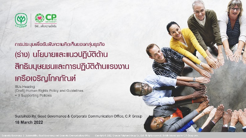 เครือเจริญโภคภัณฑ์ดำเนินการทบทวนนโยบายและแนวปฏิบัติด้านสิทธิมนุษยชนและการปฏิบัติด้านแรงงานและนโยบายย่อย 3 ฉบับ เพื่อให้ครอบคลุมประเด็นความท้าทายและความคาดหวังด้านสิทธิมนุษยชนและการปฏิบัติด้านแรงงาน รวมถึงบริบทของการดำเนินธุรกิจในปัจจุบัน โดยได้จัดการประชุมเชิงปฏิบัติการเมื่อวันที่ 18 มีนาคม 2565 เพื่อเปิดโอกาสให้ผู้แทนจากทุกกลุ่มธุรกิจในเครือร่วมแสดงความคิดเห็นต่อร่างนโยบายดังกล่าว โดยมีผู้เข้าร่วมประชุมทั้งสิ้น 67 ท่านจากทุกกลุ่มธุรกิจ